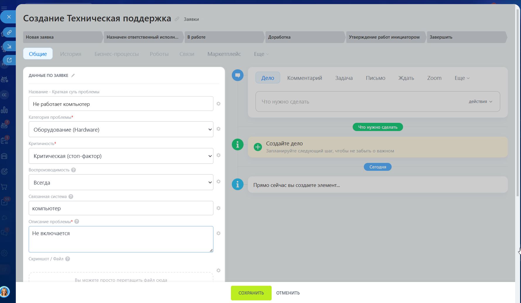 Сотрудник создаёт заявку — выбрал категорию, написал проблему, указал срочность