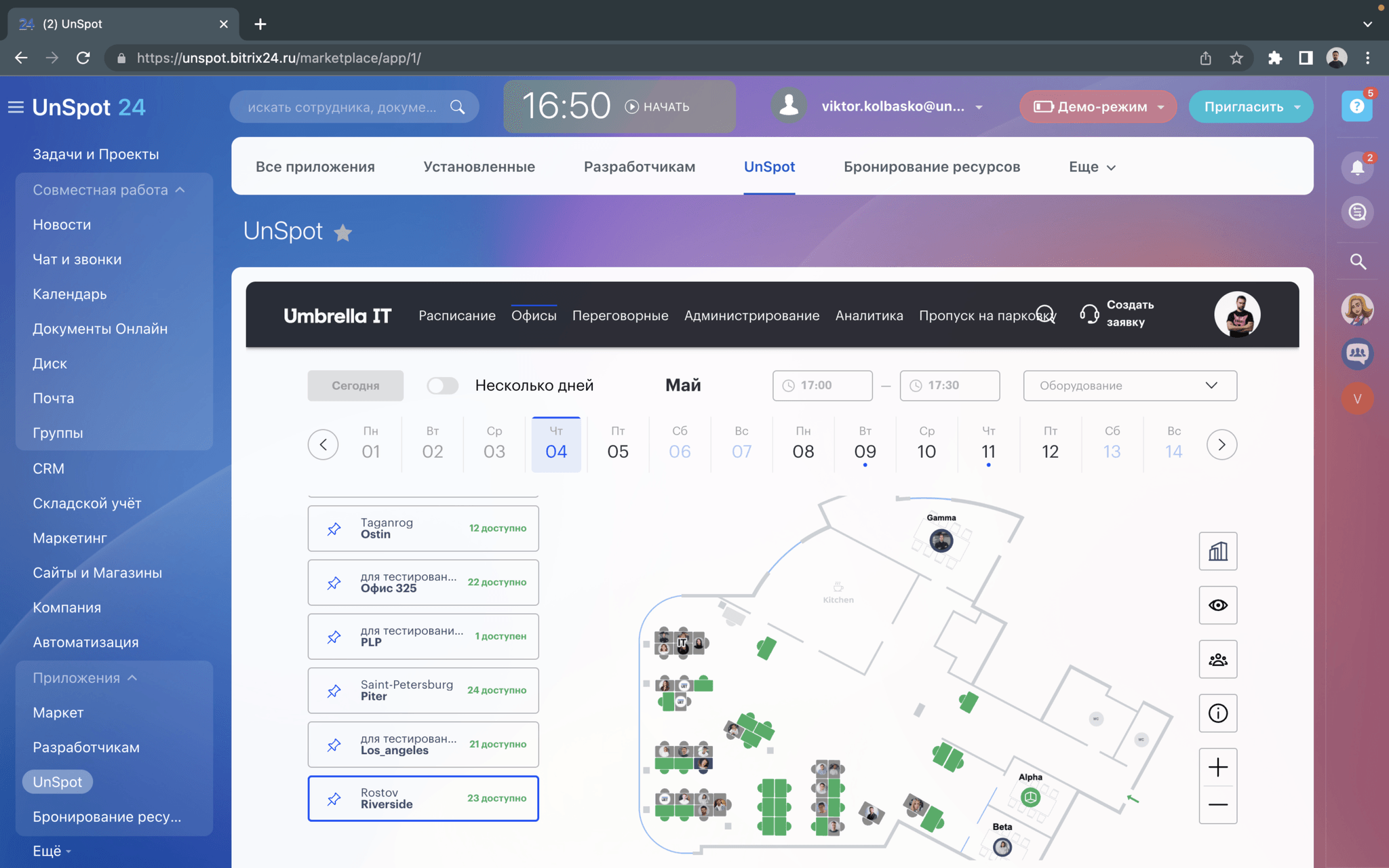 - Если вам срочно нужна переговорная комната, а времени искать свободный слот в расписании нет, откройте интерактивную карту офиса и кликните по любой свободной переговорке, отмеченной зеленым цветом.