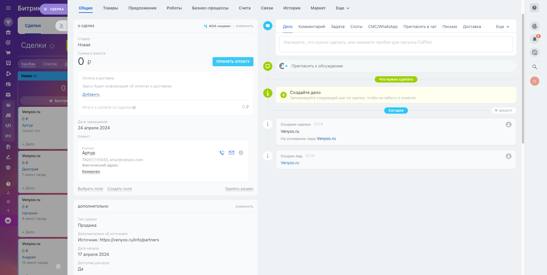 Интеграция между Venyoo и Битрикс24 обеспечивает передачу разнообразных данных для создания лидов и обеспечения эффективного взаимодействия с клиентами. Это позволяет эффективно управлять лидами и оперативно реагировать на запросы клиентов, поддерживая качественное взаимодействие через Битрикс24.