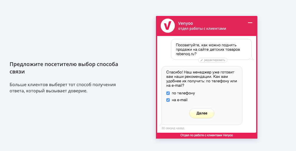 Venyoo - https://venyoo.ru/ - это живой чат для вашего сайта, способствующий увеличению продаж и улучшению связи с клиентами. Мы уже более 5 лет занимаемся лидогенерацией, обработав уже более 10 миллионов заявок. Наша команда ежедневно работает над развитием Venyoo, улучшая отношения между бизнесом и клиентами.