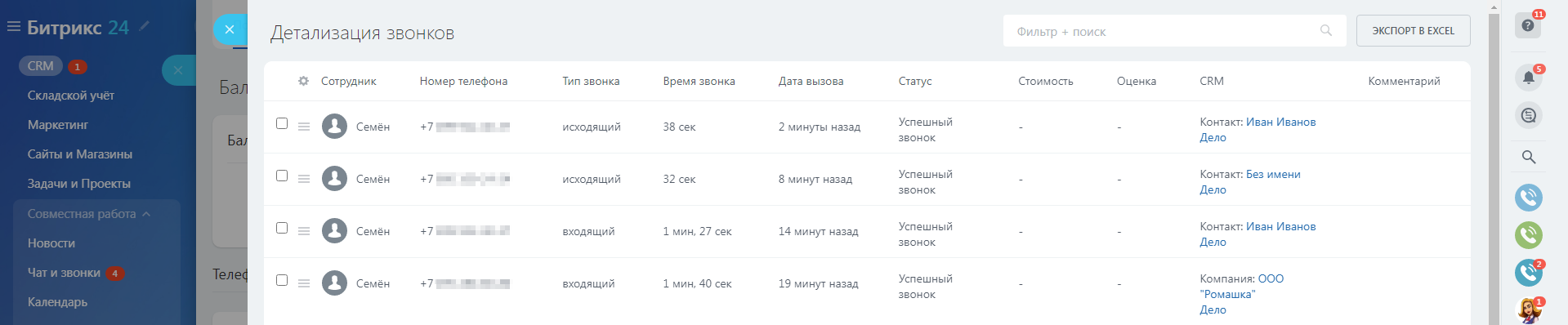 - просмотр и прослушивание телефонных переговоров с клиентом из интерфейса Битрикс24;