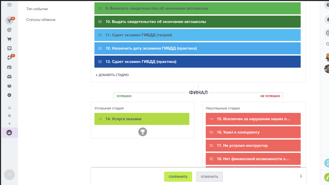 - Услуга оказана (на этой стадии менеджер определяет, нужно ли направлять клиента на пересдачу. если нужно, то создается копия сделки в воронке продаж для продажи пересдачи, если не нужно, то сделка в воронке обучения закрывается)