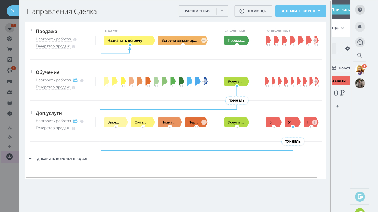 - Продажа осуществлена (на этой стадии менеджер определяет что приобрел клиент, обучение или дополнительную услугу и в зависимости от выбора менеджера сделка создается в нужном направлении автоматически)