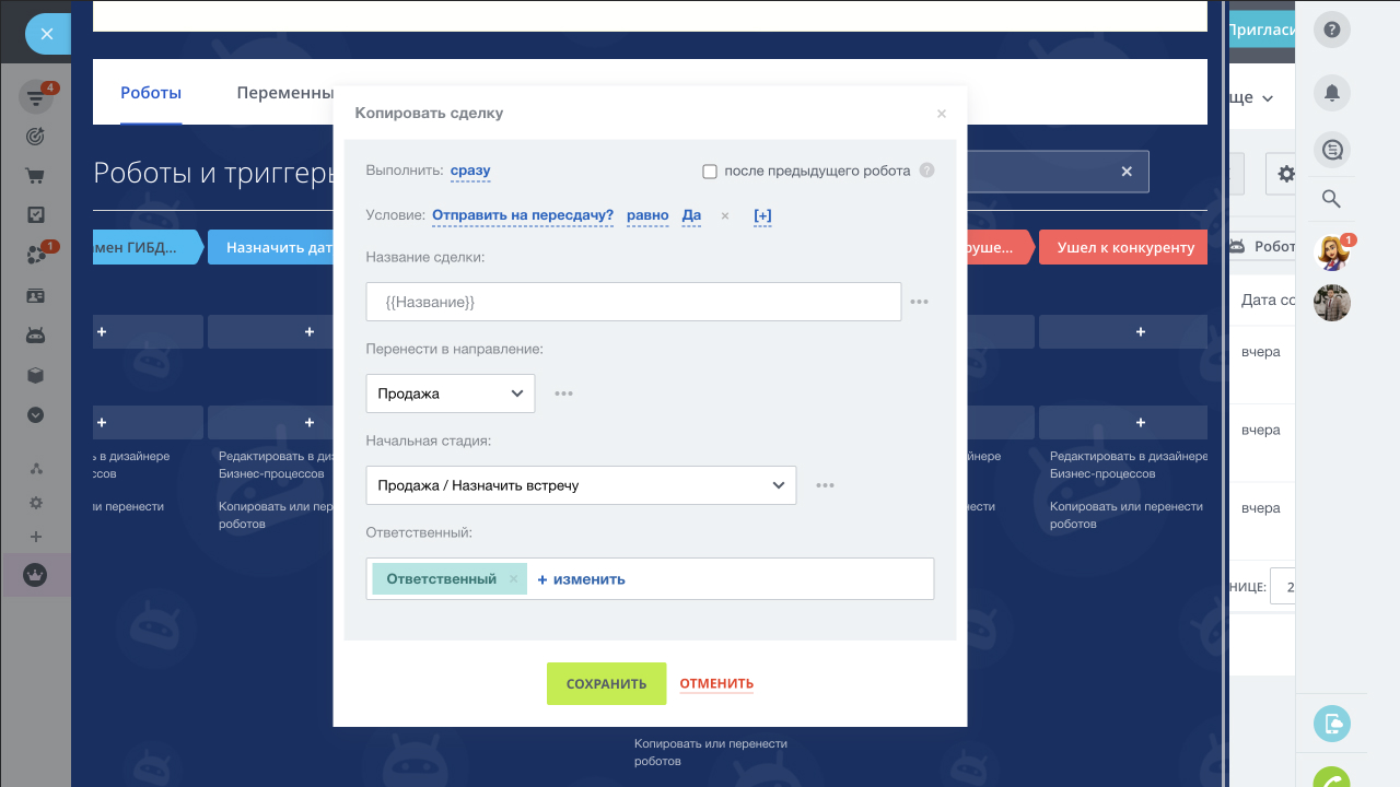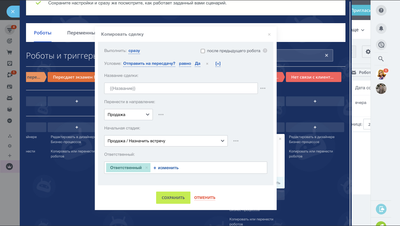 - Услуги оказаны/экзамен не сдан (на этой стадии менеджер определяет, нужно ли направлять клиента на пересдачу. если нужно, то создается копия сделки в воронке продаж для продажи пересдачи, если не нужно, то сделка в воронке обучения закрывается)