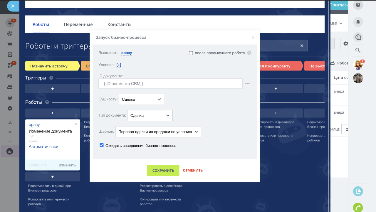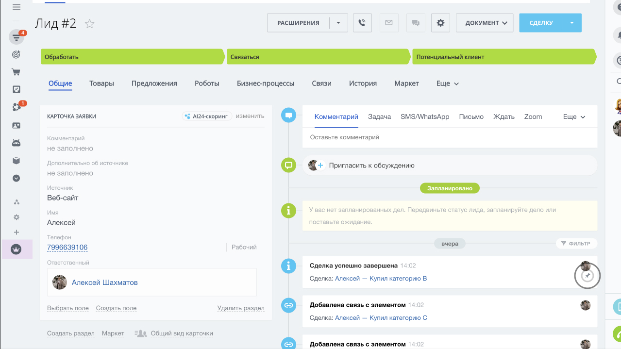 Карточка сделки содержит: