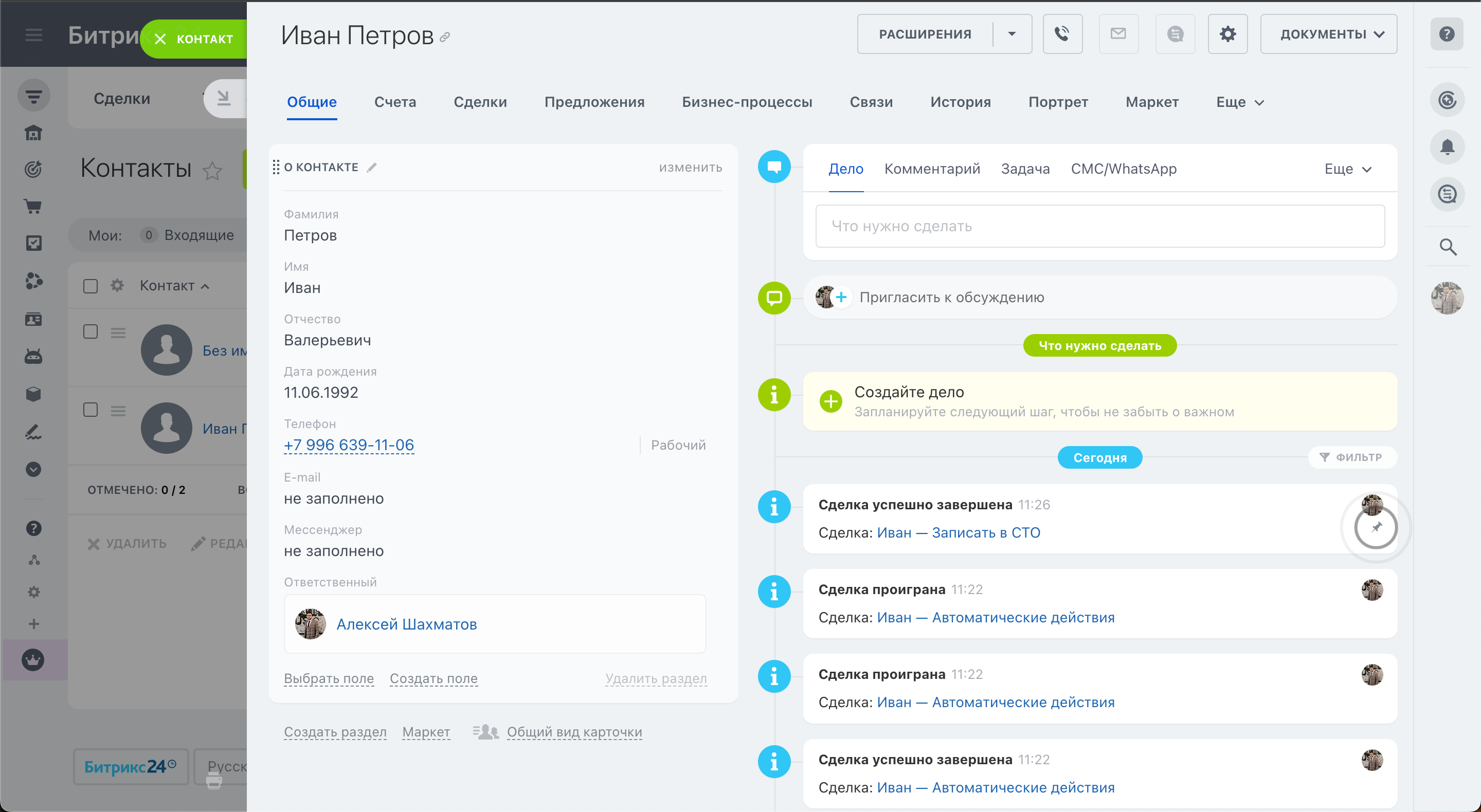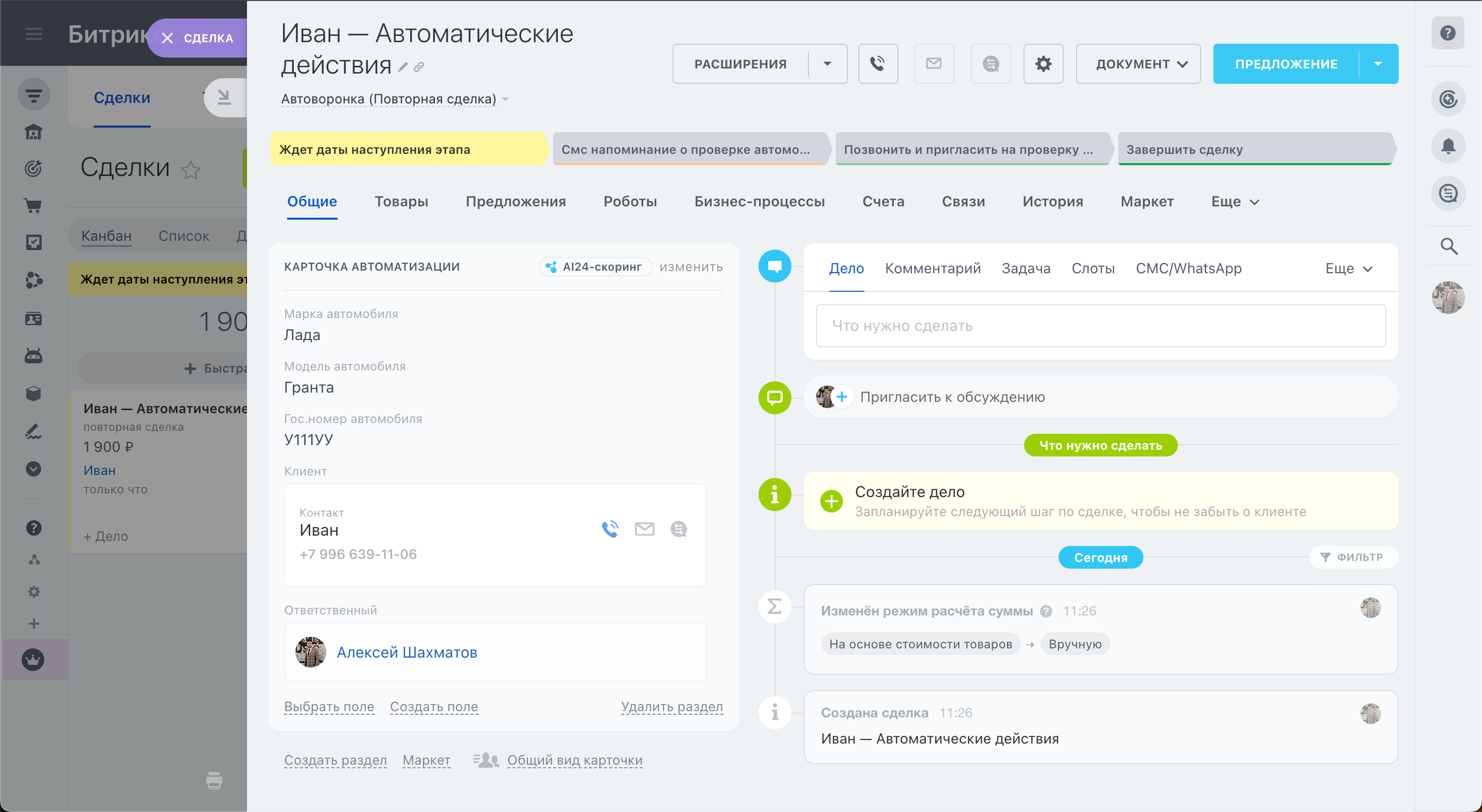 Карточка сделки содержит: