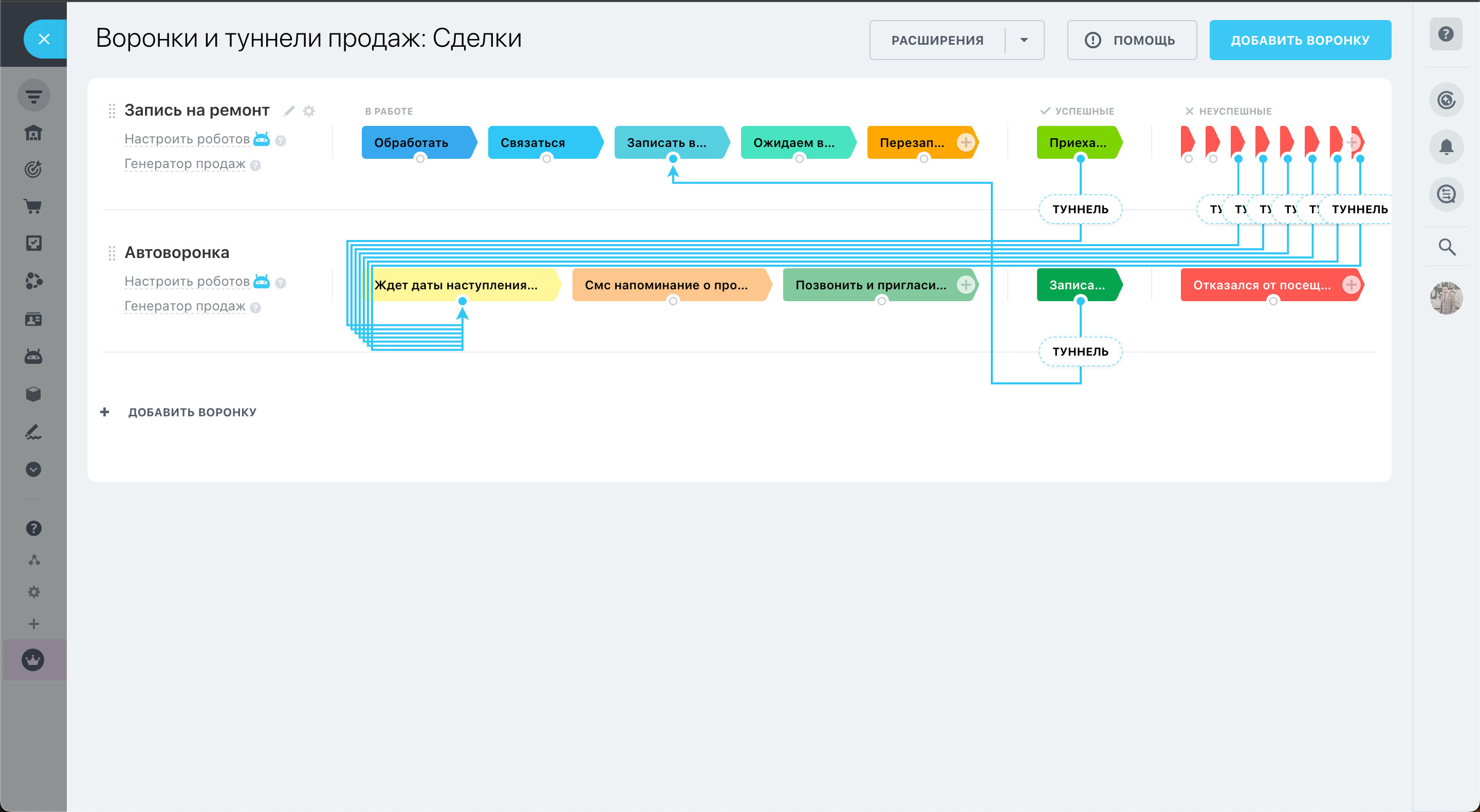 С помощью нашего решения вы сможете взять под контроль процесс продажи и оказания услуг для своих клиентов. Мы разработали воронку продаж и воронку автоматических уведомлений. С помощью этого функционала вы возьмете под контроль весь входящий трафик и сможете эффективно с ним работать. Воронка с автоматическими напоминаниями разгрузит работу менеджера, а также напомнит клиенту о предстоящей проверке автомобиля.