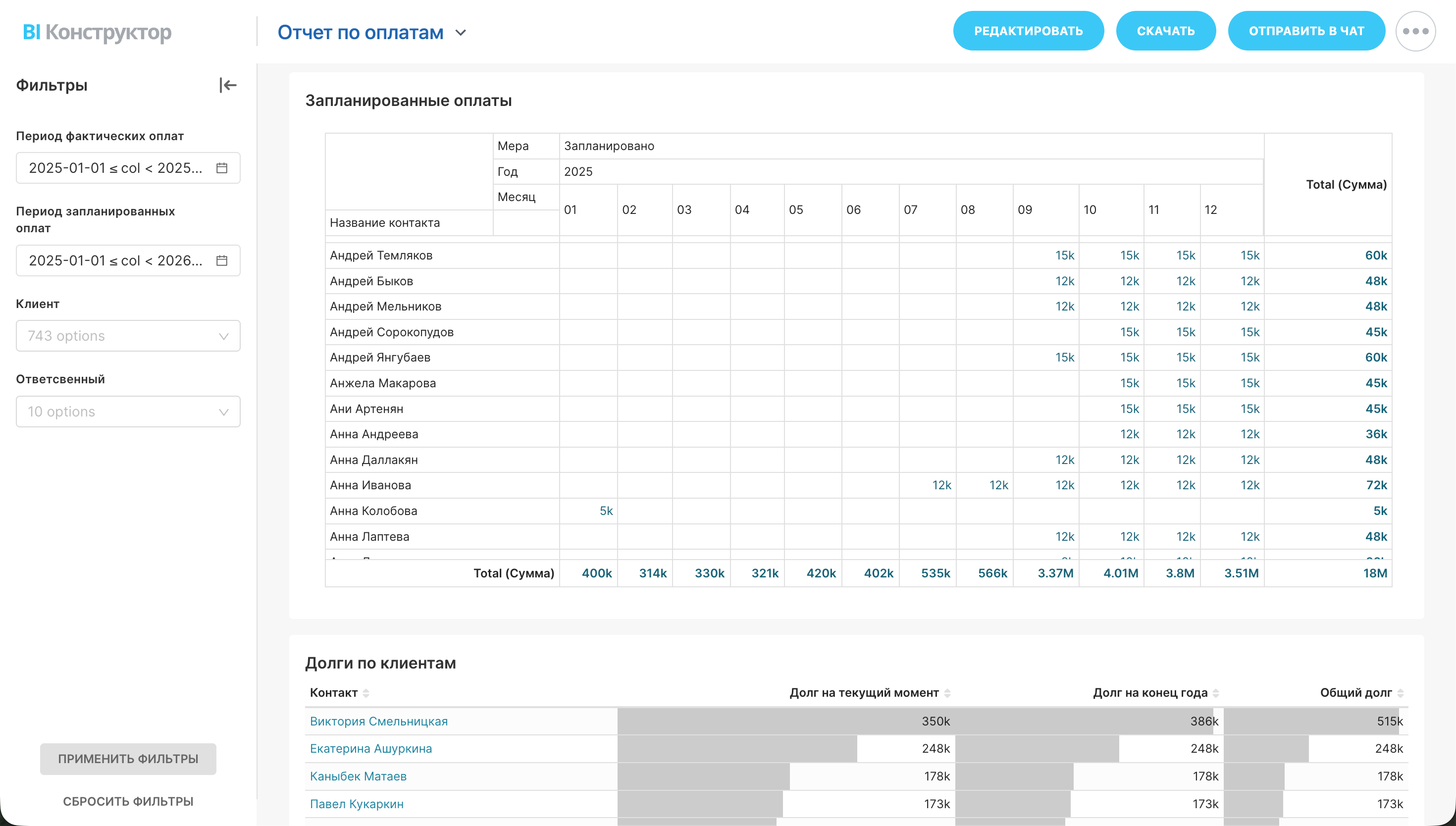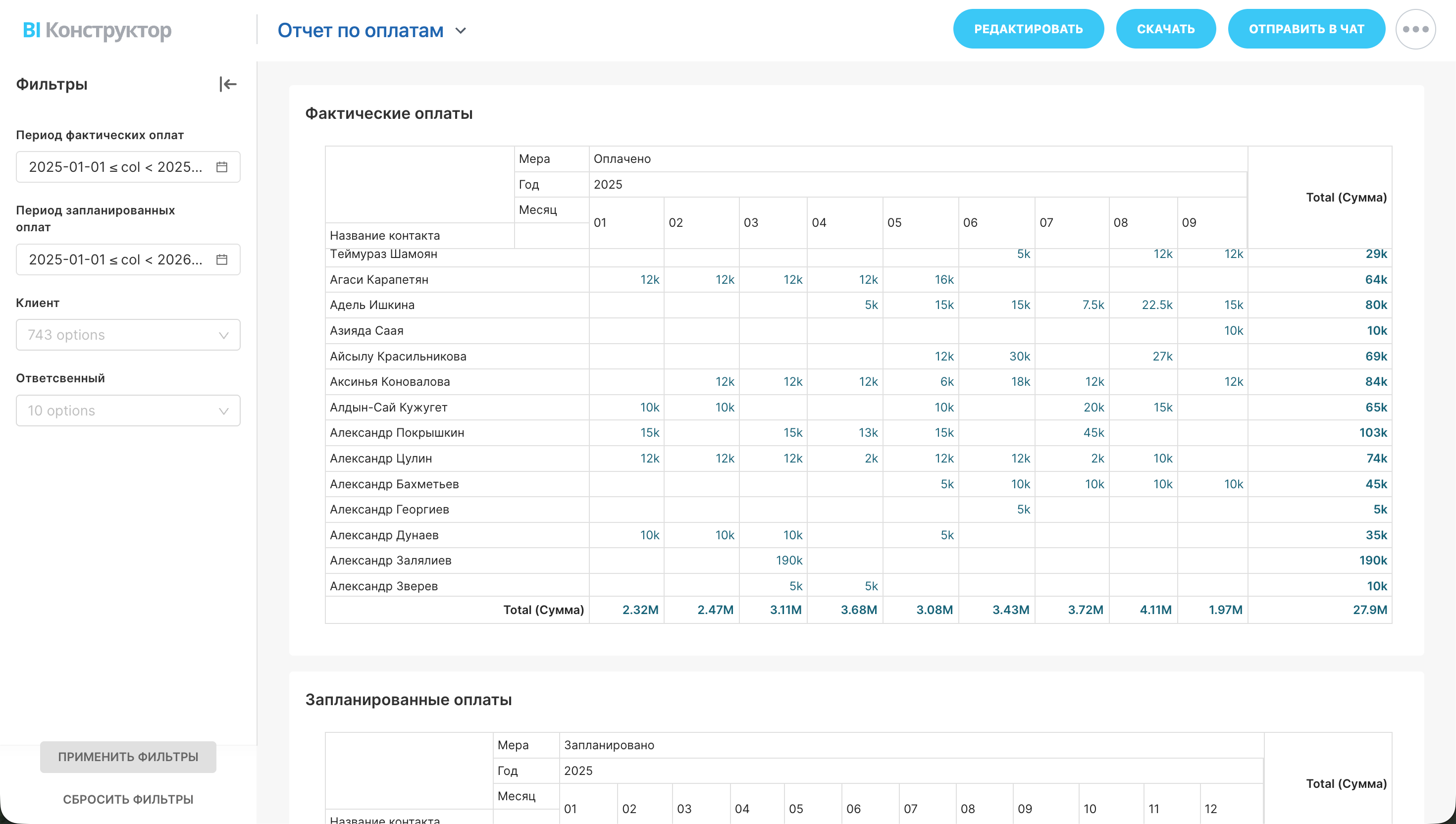 - В таблице "Фактические оплаты" вы увидите кто, сколько и когда произвел оплат в разрезе каждого месяца.
