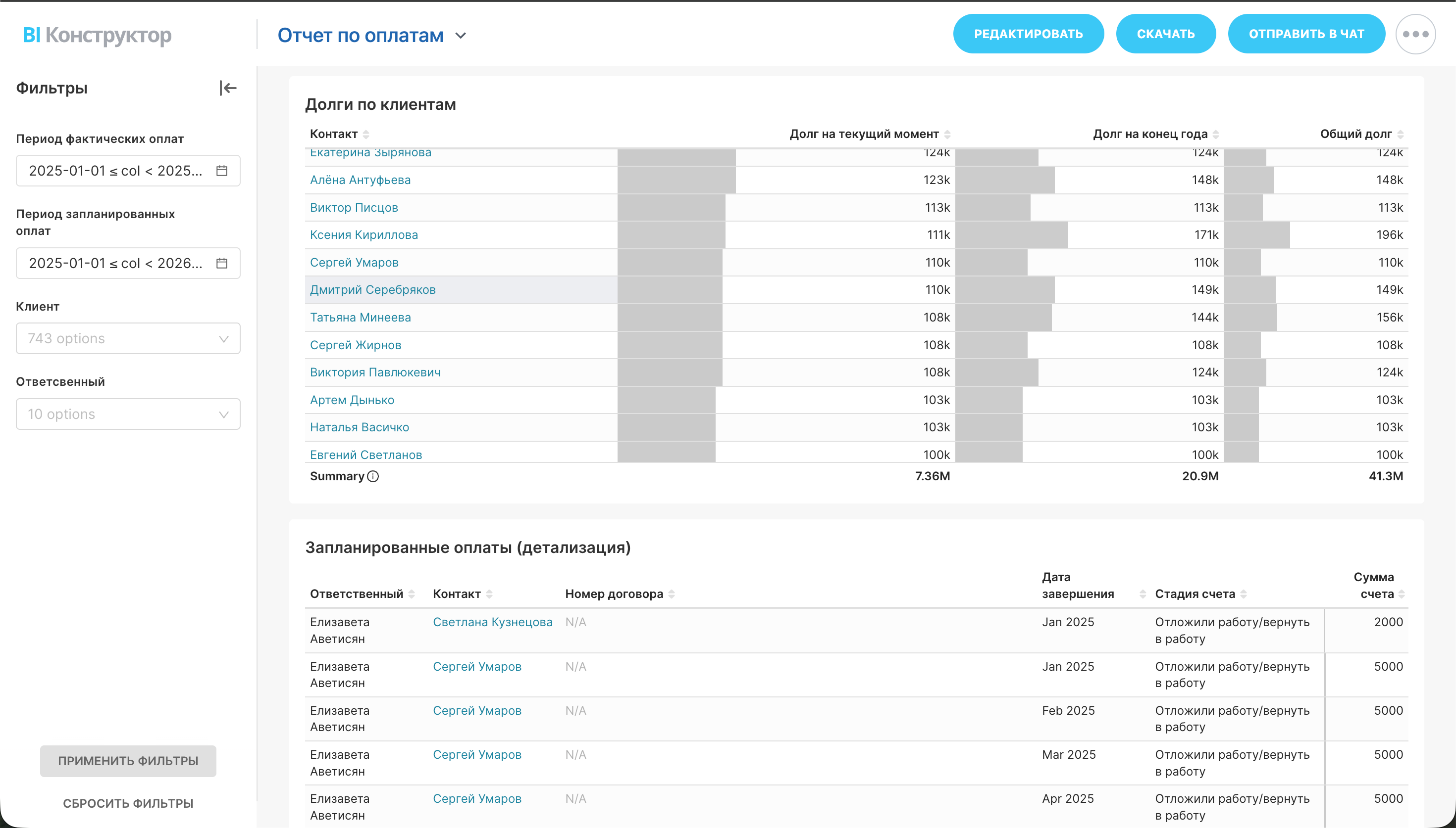 - В детализации "Запланированные оплаты" вы сможете отсортировать клиентов с задолженностью по сумме, дате, стадии счета, ответственному и клиенту.