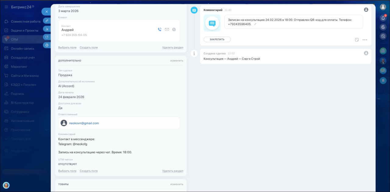 3. Когда клиент оставляет контакты или готов к покупке — AI создаёт сделку в Битрикс24
