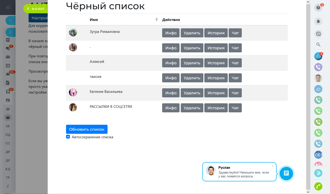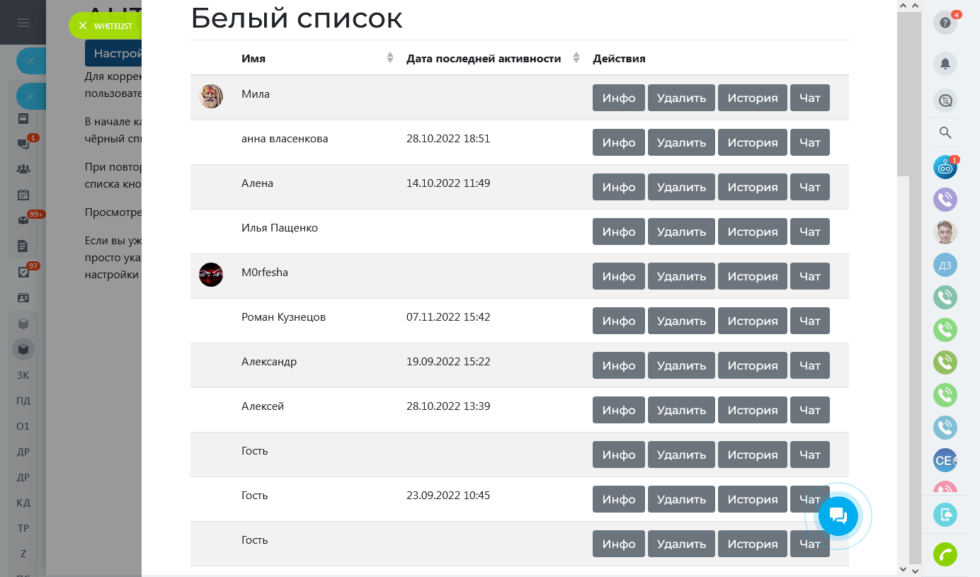 Содержимое чёрного и белого списка можно редактировать в окне приложения. По каждой записи списка можно увидеть историю диалогов, можно открыть чат, можно посмотреть техническую информацию о записи, а также можно удалить пользователя, ошибочно занесённого в чёрный или белый список.