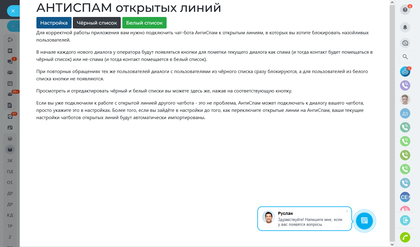 Приложение позволяет вести чёрный и белый список контактов открытых линий. Если контакт находится в чёрном списке, все его обращения помечаются как спам и не попадают к оператору. Если контакт внесён в белый список, его диалоги считаются не требующими обработки приложением.