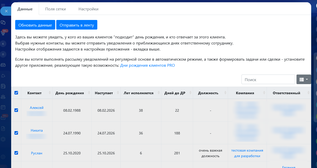 Для просмотра информации зайдите в приложение (пункт меню "Дни рождения клиентов"). Для отправки информации в живую ленту нажмите соответствующую кнопку. В настройках вы можете указать текст для публикации в ленте, а также за какое количество дней до ДР показывать контакты.