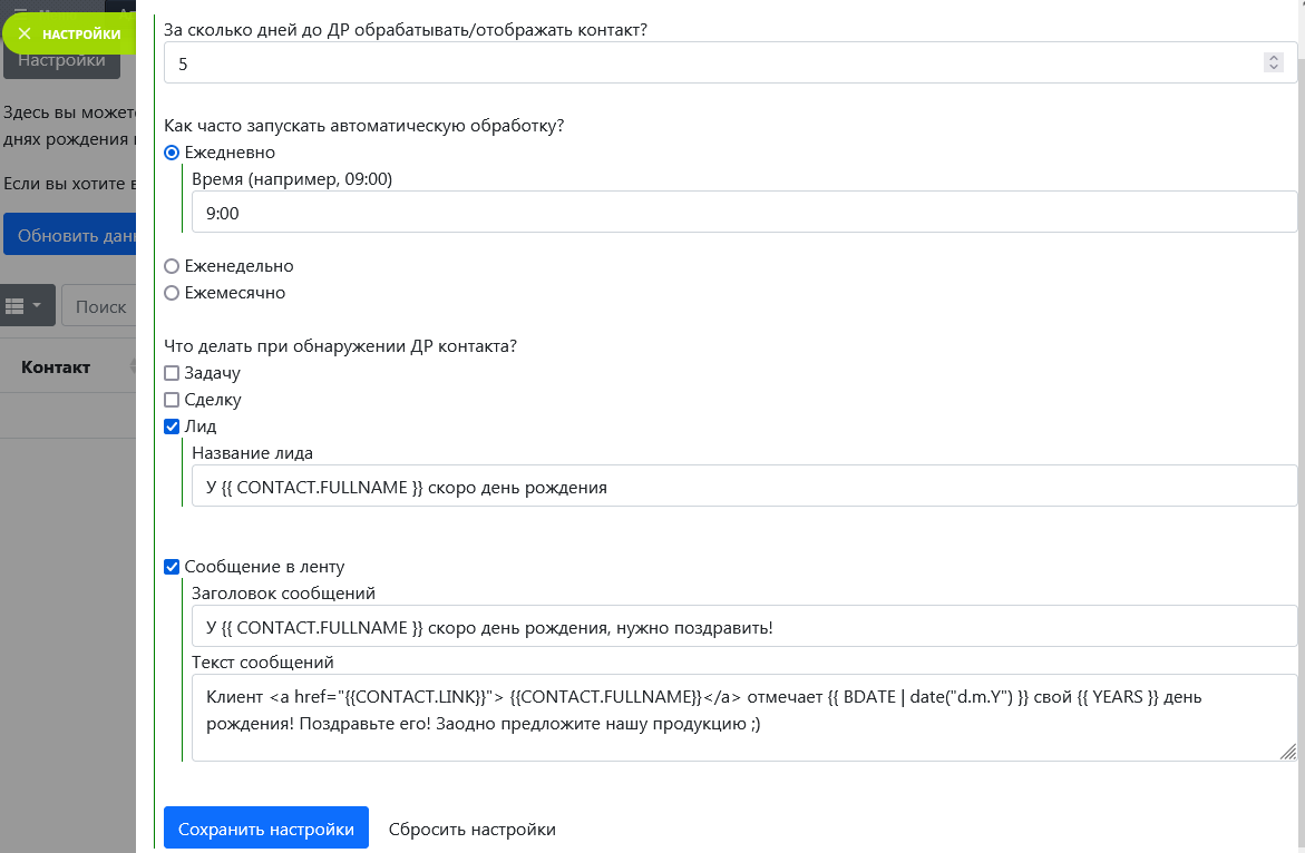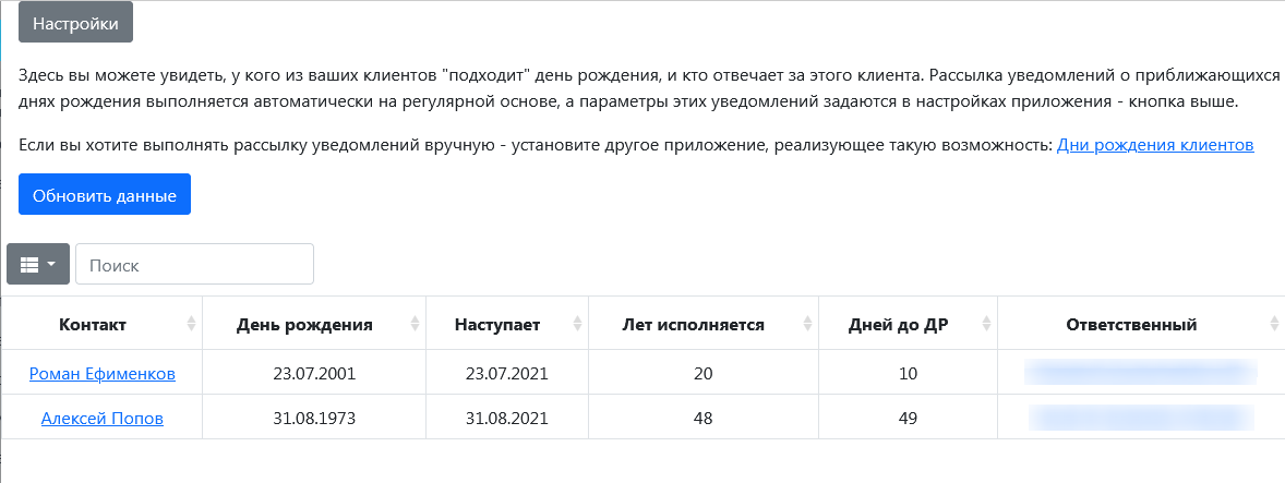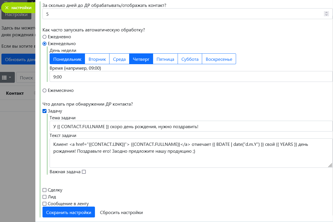 Для просмотра информации зайдите в приложение (пункт меню "ДР клиентов PRO") или настройте показ поля в карточке контакта. Для регулярной отправки информации выполните настройку расписания и выберите действия, которые нужно выполнять.