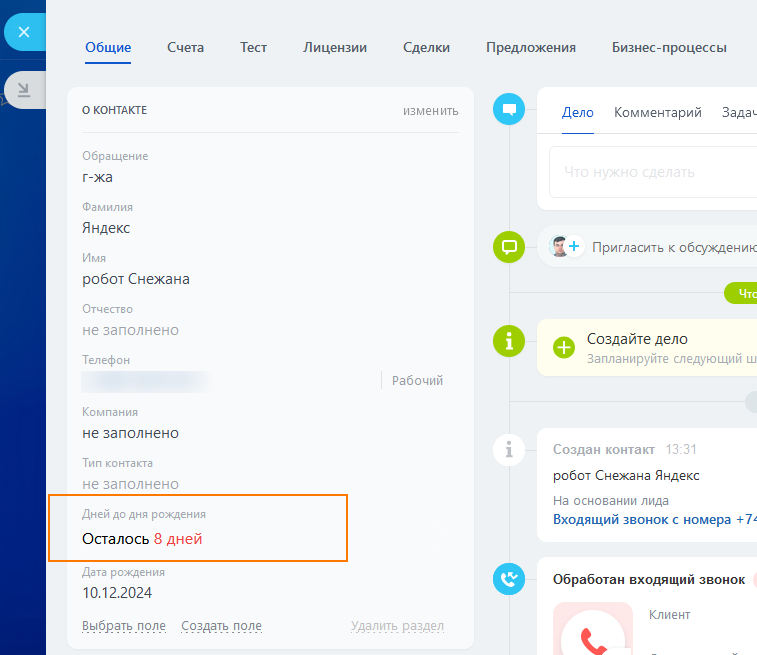 Наше приложение показывает наступающие дни рождения контактов CRM (используются стандартные поля контактов CRM для анализа данных), для этого в карточке контакта создаётся дополнительное поле, где показывается, сколько дней осталось до дня рождения контакта. На основе этих данных могут автоматически по расписанию (ежедневно, еженедельно, ежемесячно) формироваться для сотрудников лиды, сделки, дела в контакте, задачи, либо просто сообщения сотруднику в живую ленту.