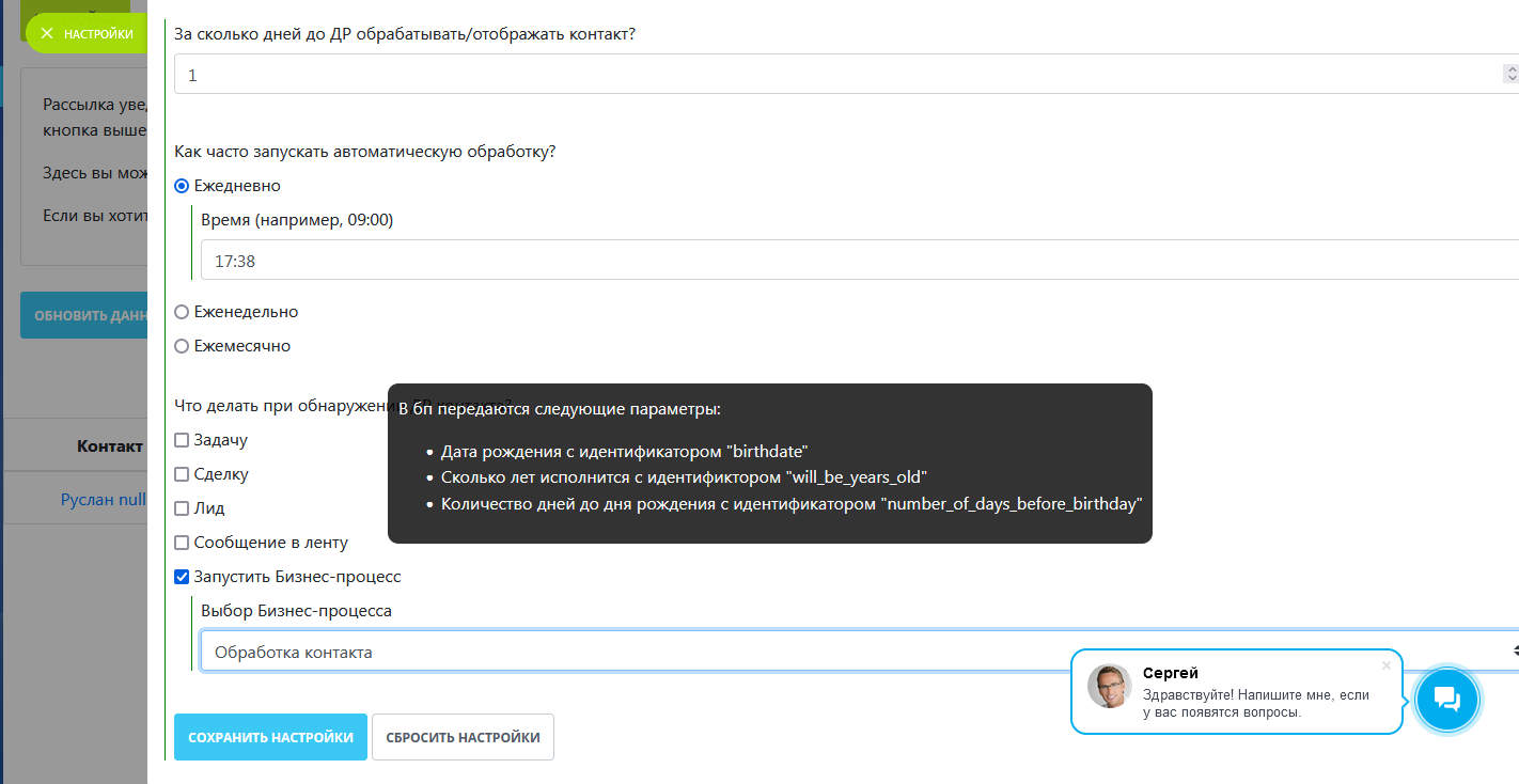 Для действия "Запуск бизнес-процесса" доступны любые бизнес-процессы на сущности "Контакт", при этом в запускаемый бизнес-процесс передаются параметры даты наступающего праздника, количества дней до ДР, количество наступающих лет. Подробности - на странице настроек.