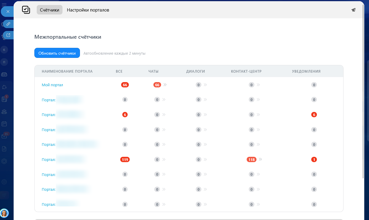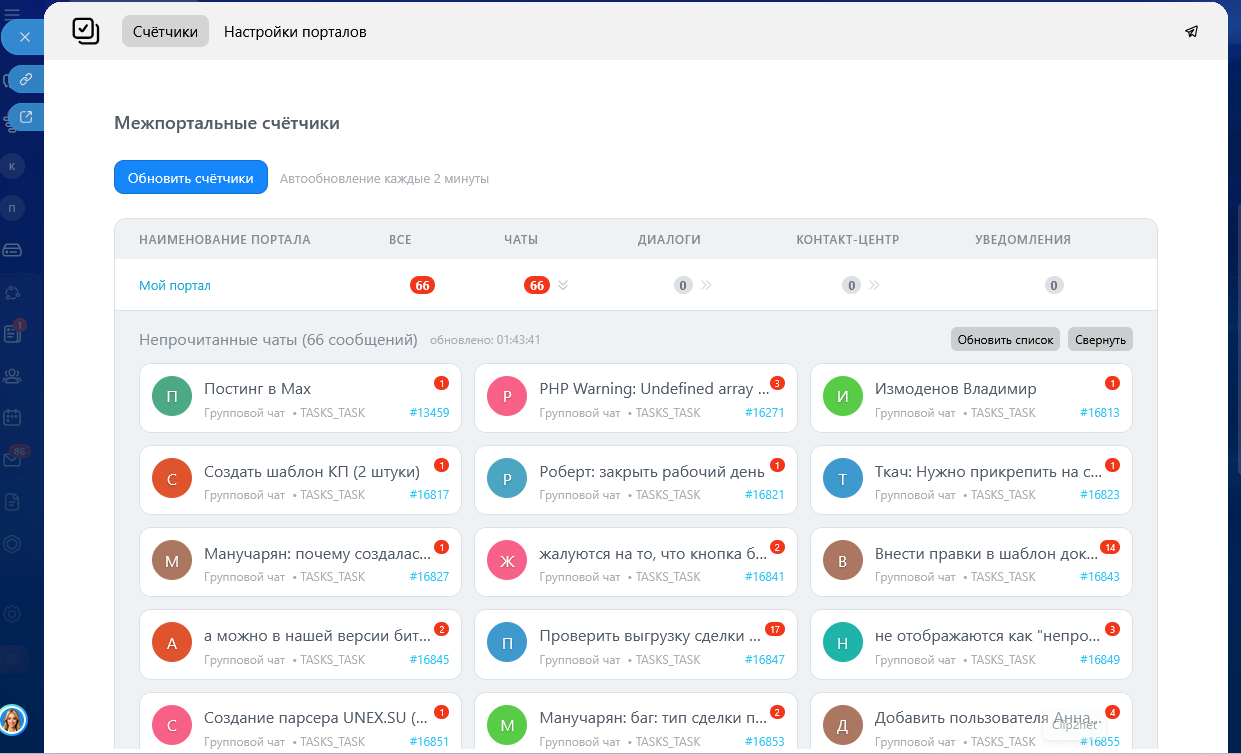 Единая панель контроля: Видите все «счётчики» (непрочитанные сообщения, в т.ч. задачи, диалоги, чаты открытых линий, уведомления) со всех подключённых порталов в одном месте.