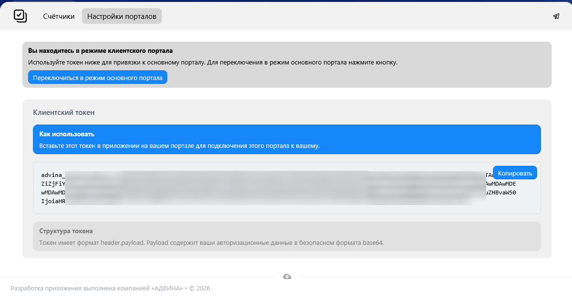 Режим «Клиентский портал»: Позволяет безопасно сгенерировать токен доступа для подключения этого портала к основному.