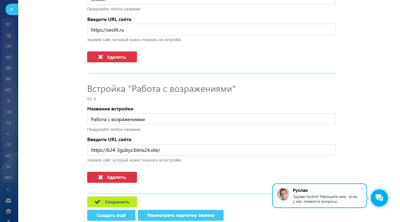 В карточке звонка отображает несколько сайтов (например, лендинг с базой знаний)