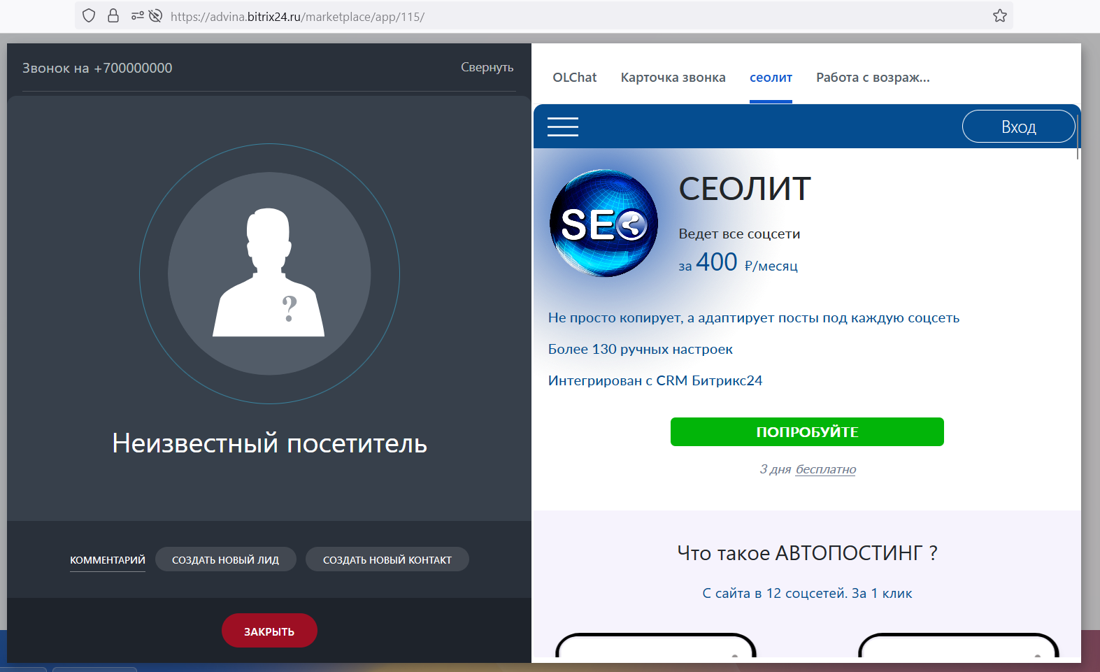 Приложение позволяет добавить в карточку звонка произвольное количество вкладок с внешними сайтами, которые полезны сотрудникам при звонках. Это могут быть страницы с вашим прайс-листом, лендинг FAQ, работа с возражениями, CRM-форма и т.д.