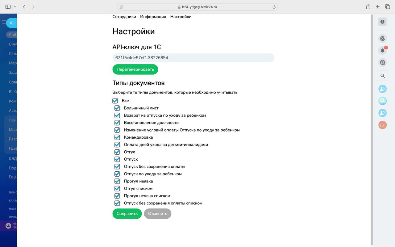 Получается что сопоставление типов документов и типов отсутствий Битрикс24 в принципе не работает, и нет возможности запретить выгрузку одних документов и разрешить других.