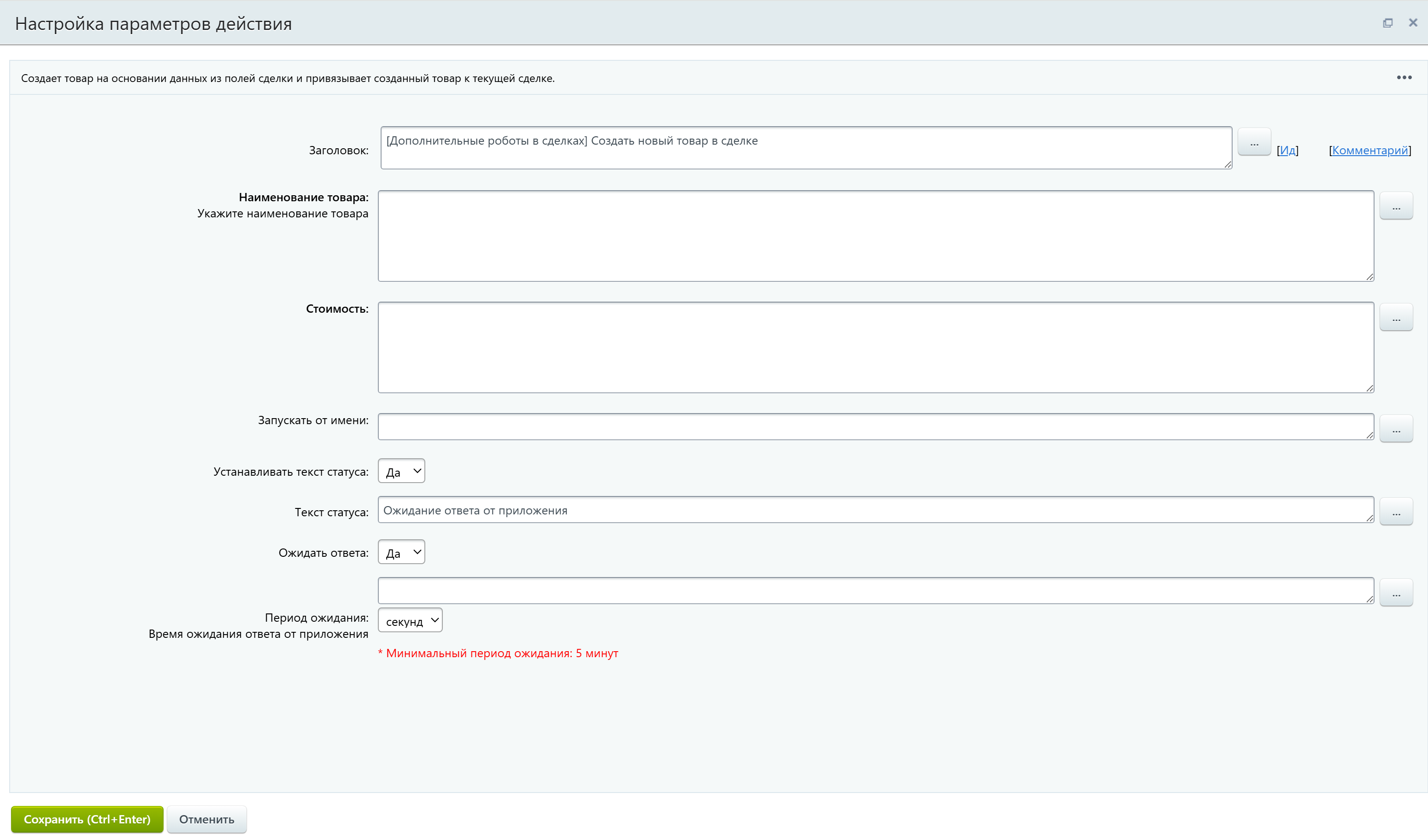 Активити создает новый товар в каталоге с произвольным названием, в котором могут фигурировать значения любых полей карточки лида/сделки и привязанных к ним контакта/компании. Дополнительно созданный товар привязывается к лиду/сделке, из которой он создается. Это позволяет на следующем шаге автоматизации генерировать счет на основании сделки.