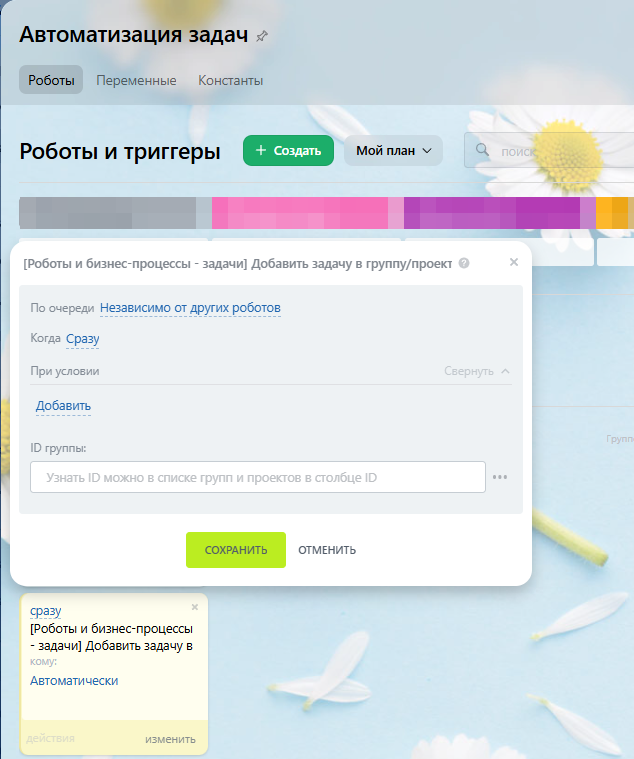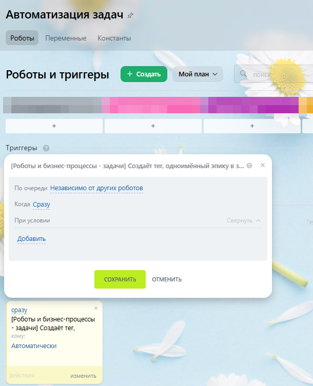 Дополнительные роботы для раздела "Задачи и Проекты": автоматическое добавление задачи в указанный проект; смена постановщика задачи; создание в задаче тэга, одноименного эпику.