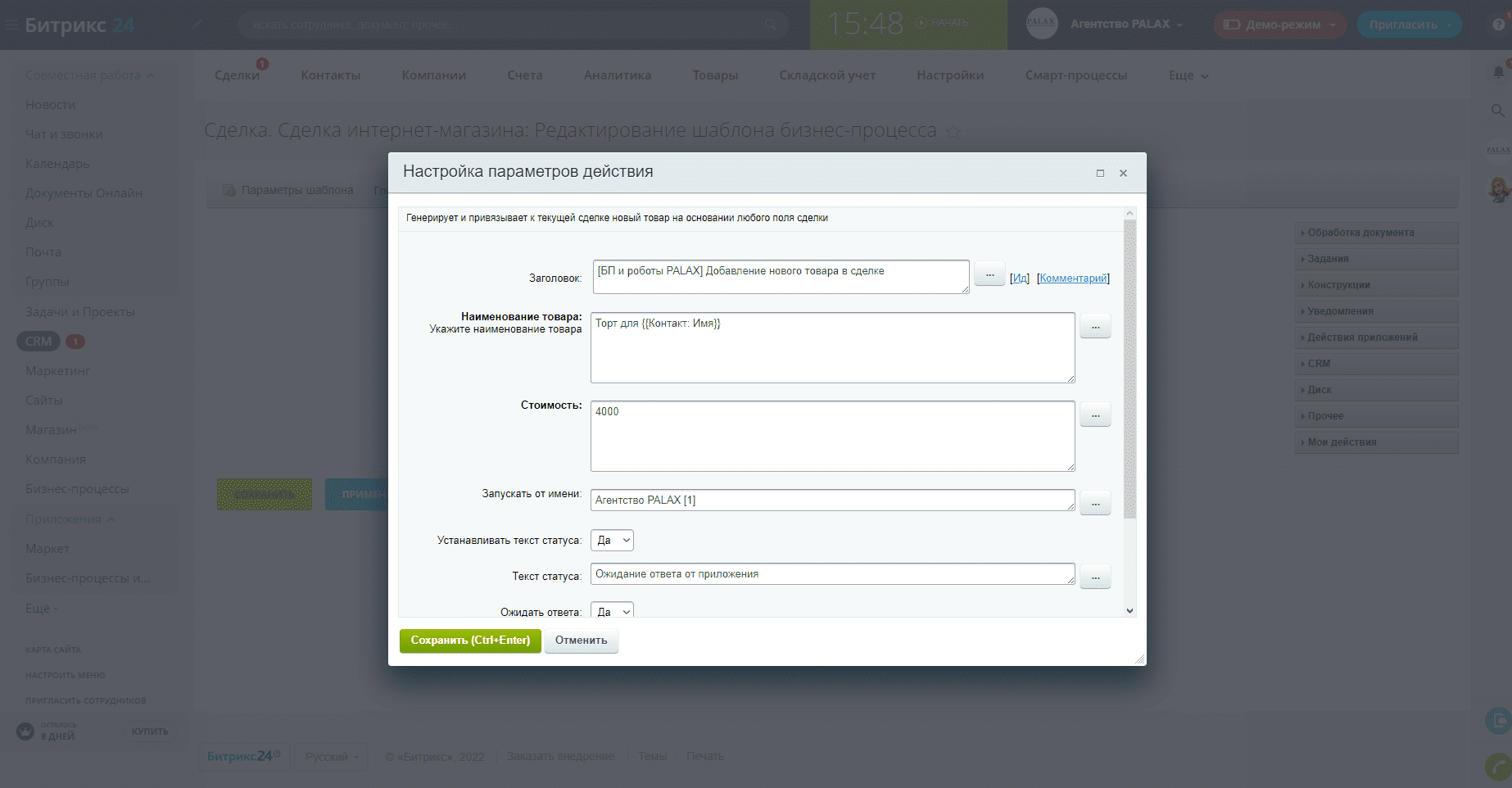 В качестве получателя можно добавить конкретного сотрудника или роль в карточке CRM, текст уведомления можно задавать произвольно с использованием значений из полей CRM.