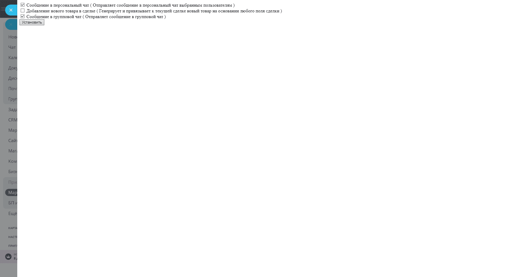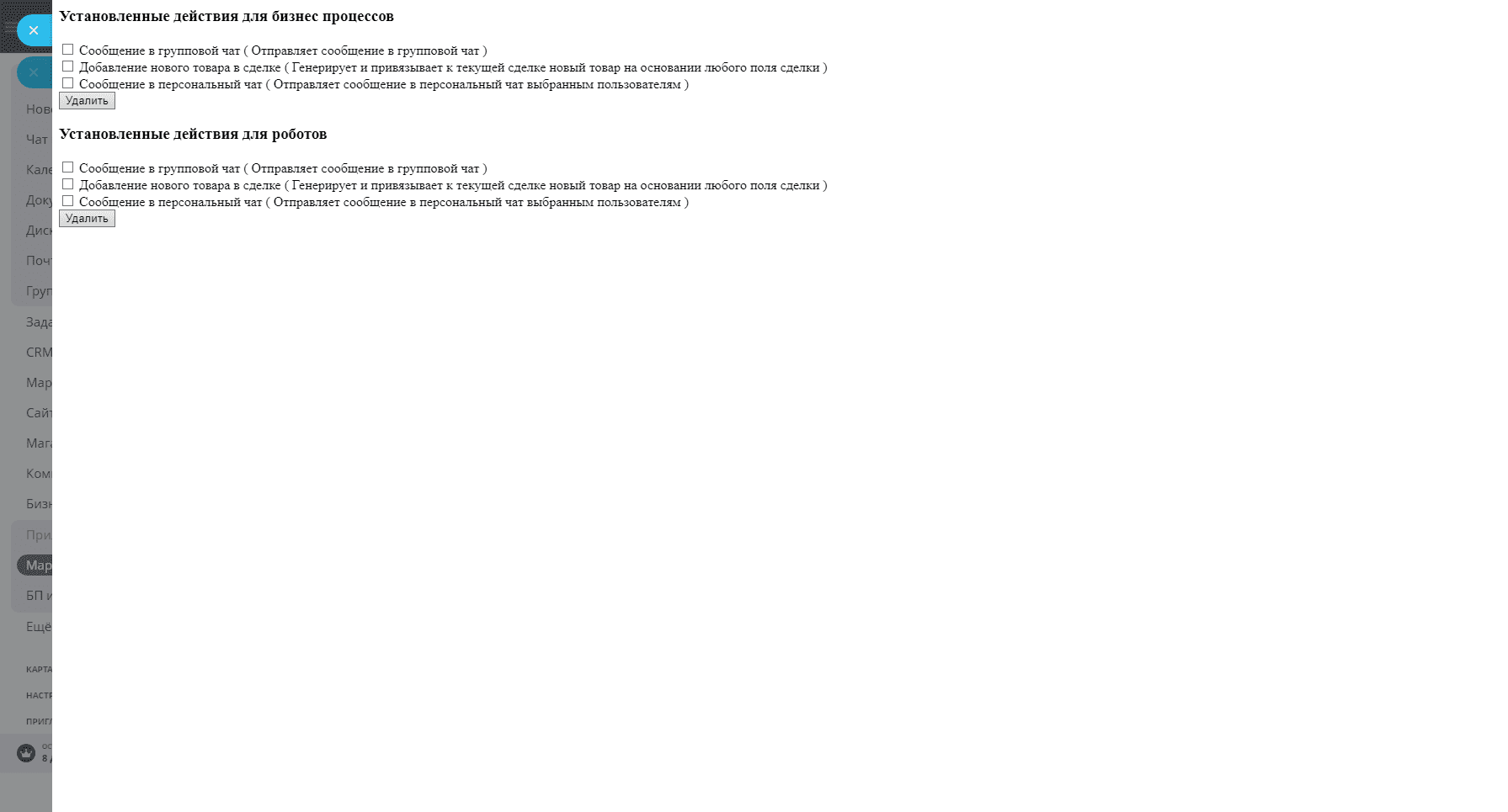В приложении представлены дополнительные действия в роботах и бизнес-процессах в CRM и роботах Роботизации бизнеса (RPA): отправка сообщений в персональный чат пользователю; отправка сообщений в групповой чат; создание товара на основании любого поля в карточке сделки/компании/контакта.