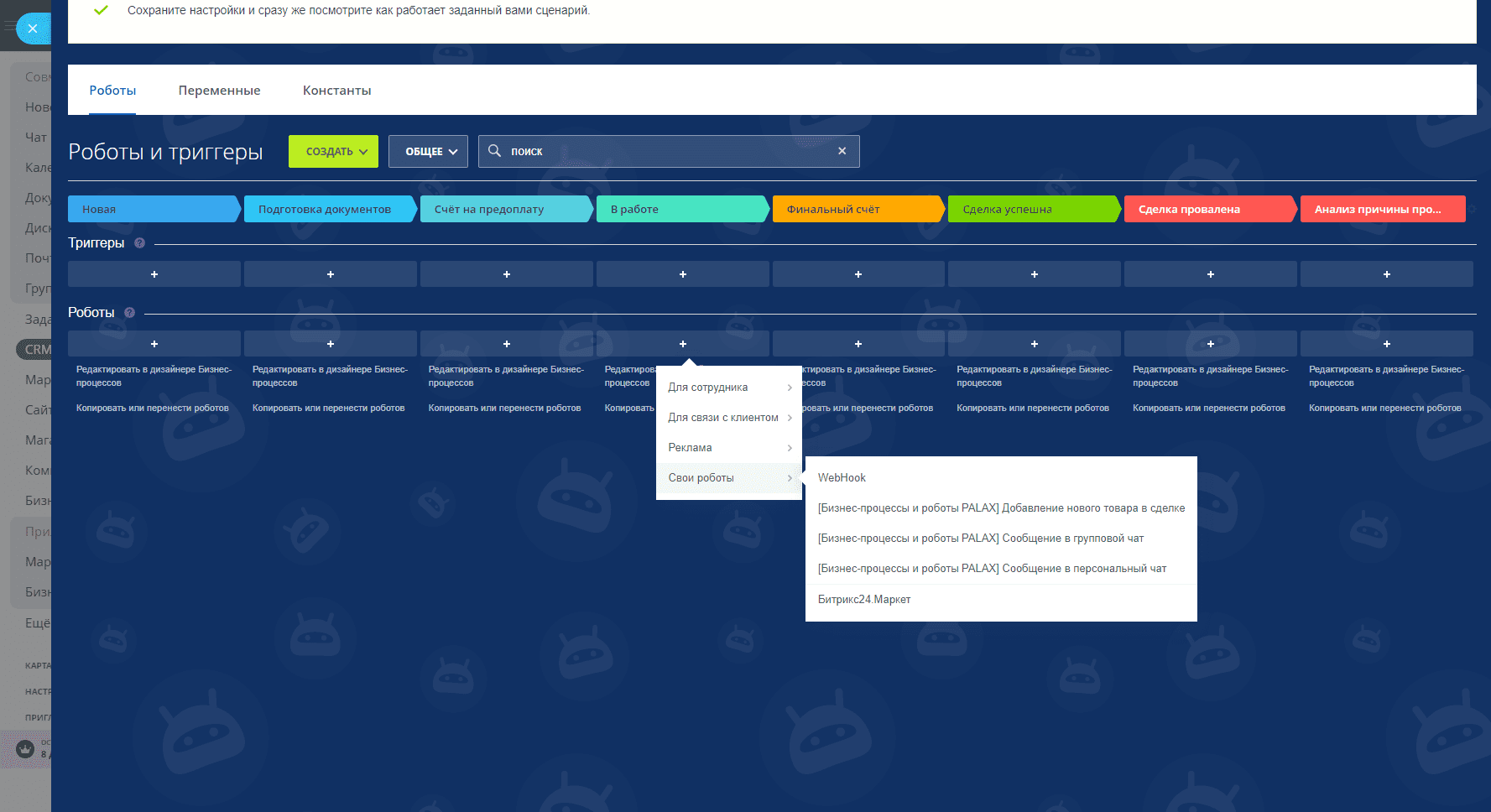 2) Дополнительные роботы в сделках https://www.bitrix24.ru/apps/app/agencypalax.ribp_deals/