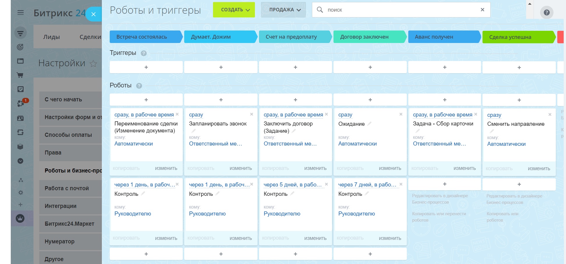 - Настроена автоматизация движения сделок по воронкам роботами (уведомления сотруднику, уведомления покупателю, авто-задачи, напоминания и контроль руководителя.