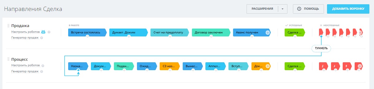 Каждое направление имеет стадии, позволяющие провести клиента от его потребностей до их удовлетворения. Использование разных воронок, позволяет оценить эффективность работы каждого направления компании по отдельности.