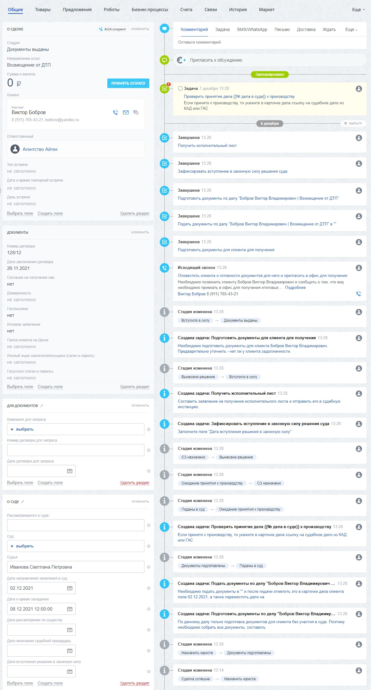 В отраслевой CRM уже создан и настроен алгоритм обработки сделок, который запускается, когда сделка перешла в необходимую стадию.