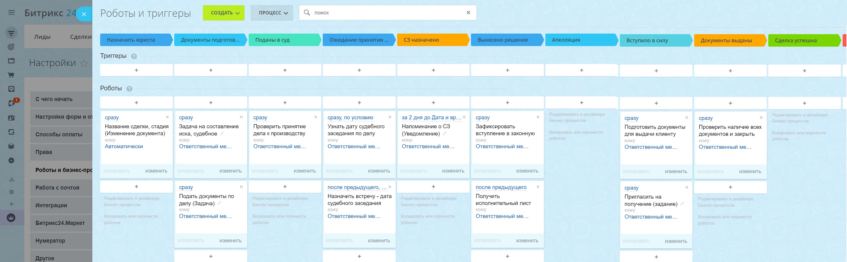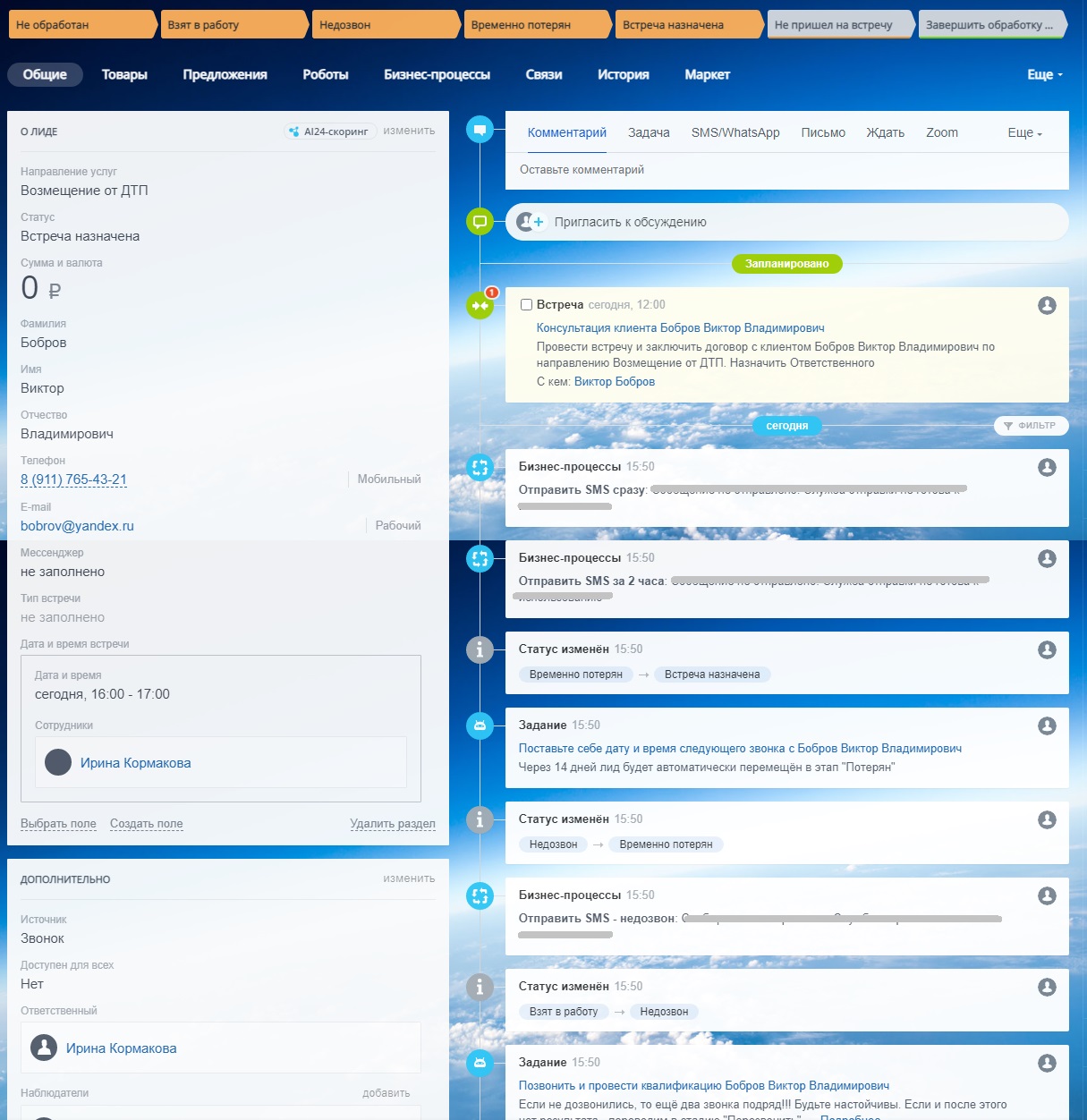 CRM настроена таким образом, чтобы статусы лидов и стадии сделок помогали менеджеру и далее юристу доводить сделки до успешного финала.