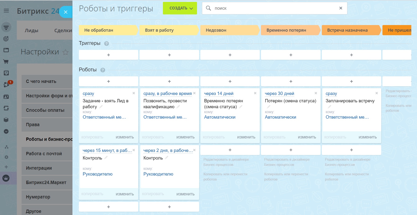 - Настроена автоматизация движения лидов и сделок по воронкам роботами (уведомления сотруднику, уведомления покупателю, авто-задачи, напоминания и контроль руководителя.