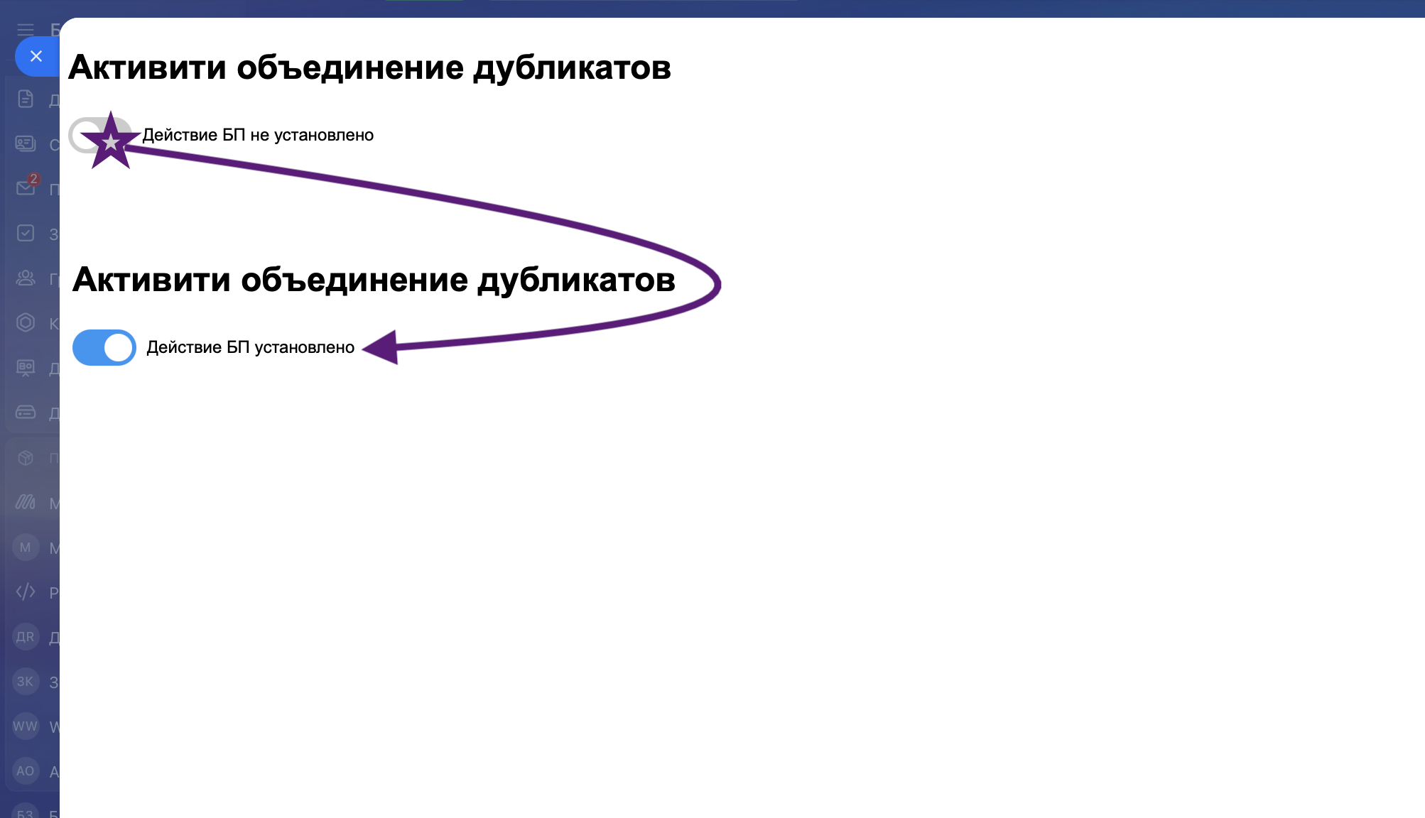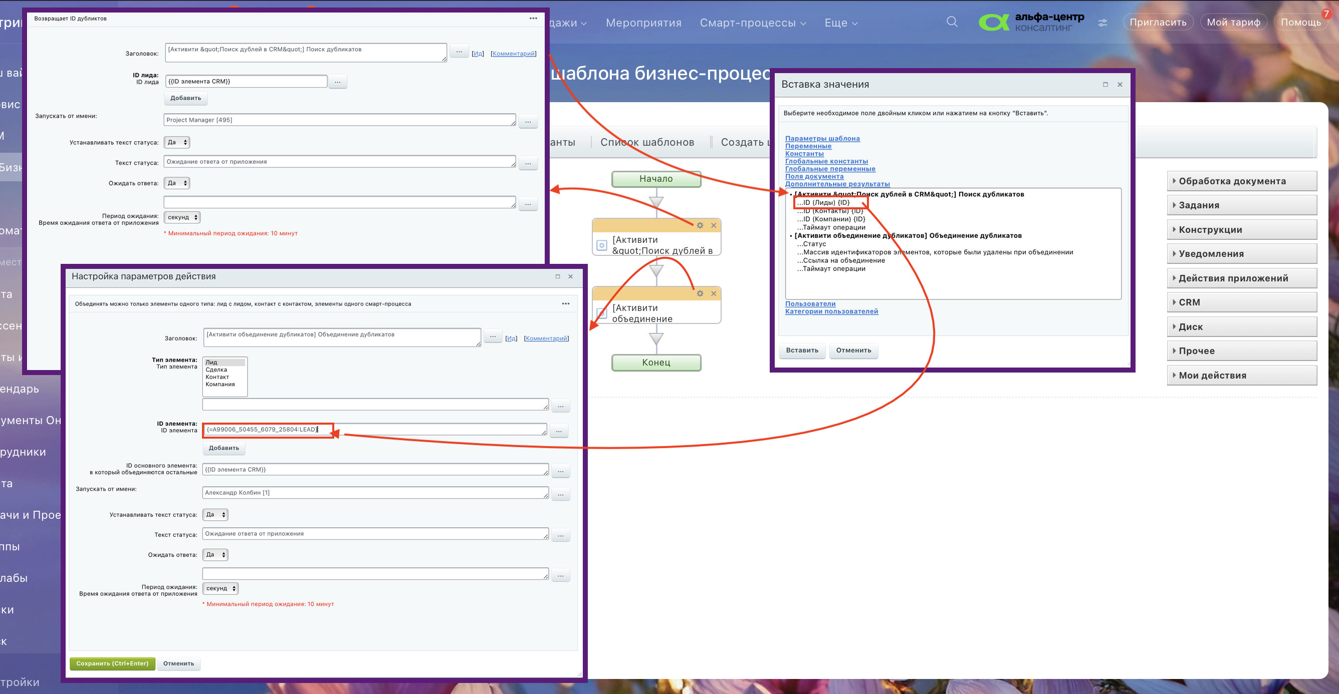 Активити "Объединение дубликатов CRM" добавляется в бизнес-процессы Битрикс24 и: