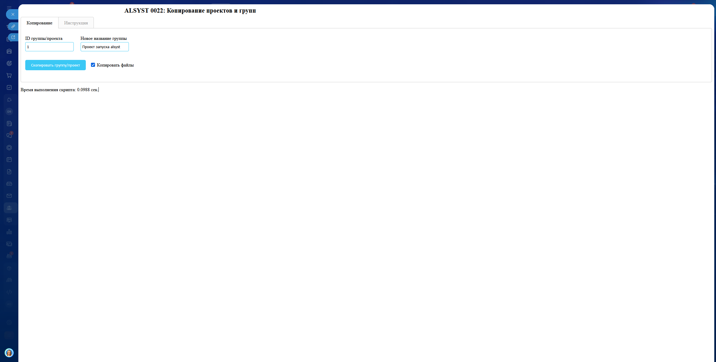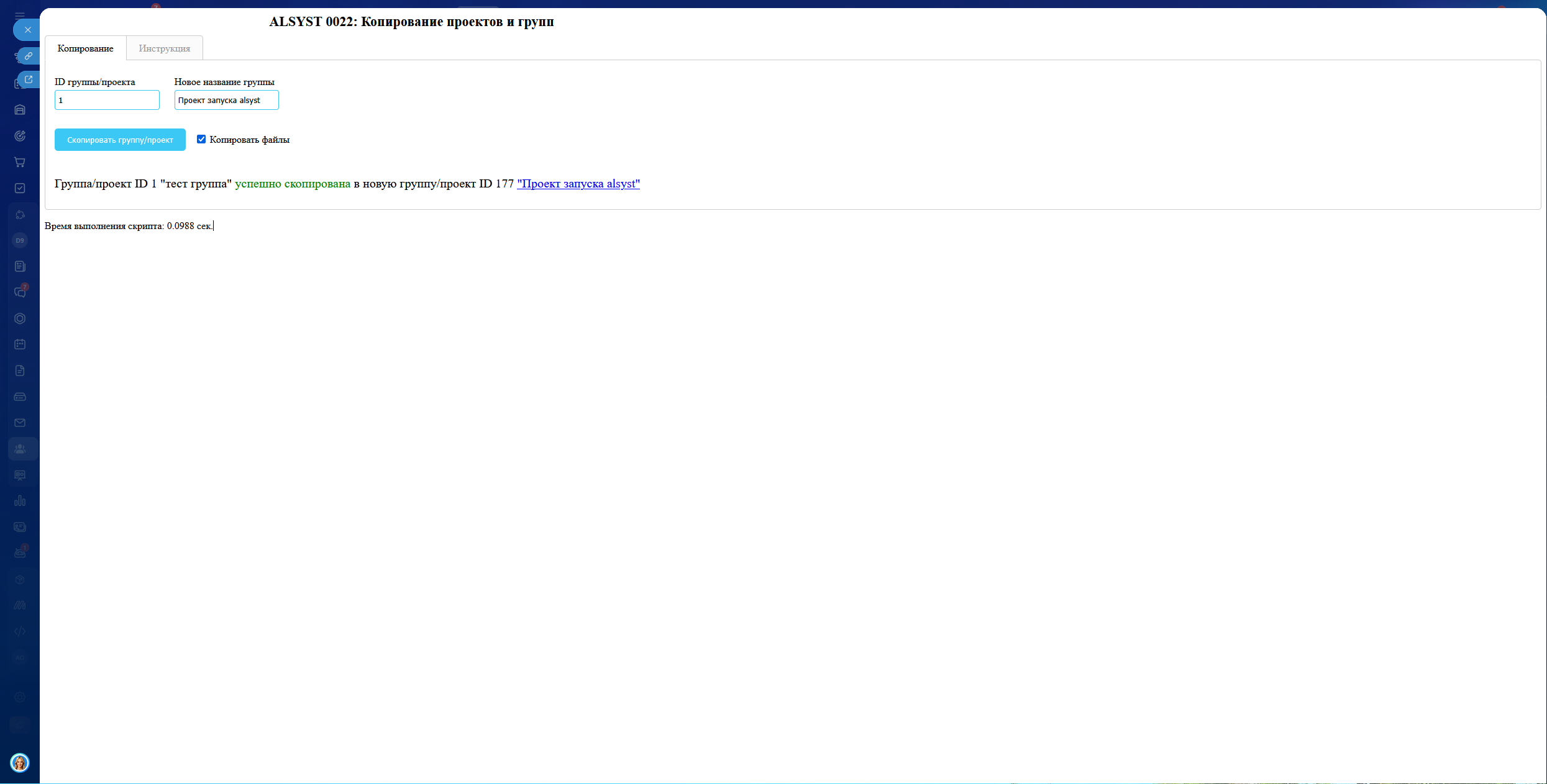 Приложение «ALSYST 0022: Копирование проектов и групп» скопирует доступные данные проекта или группы в новый проект/группу.