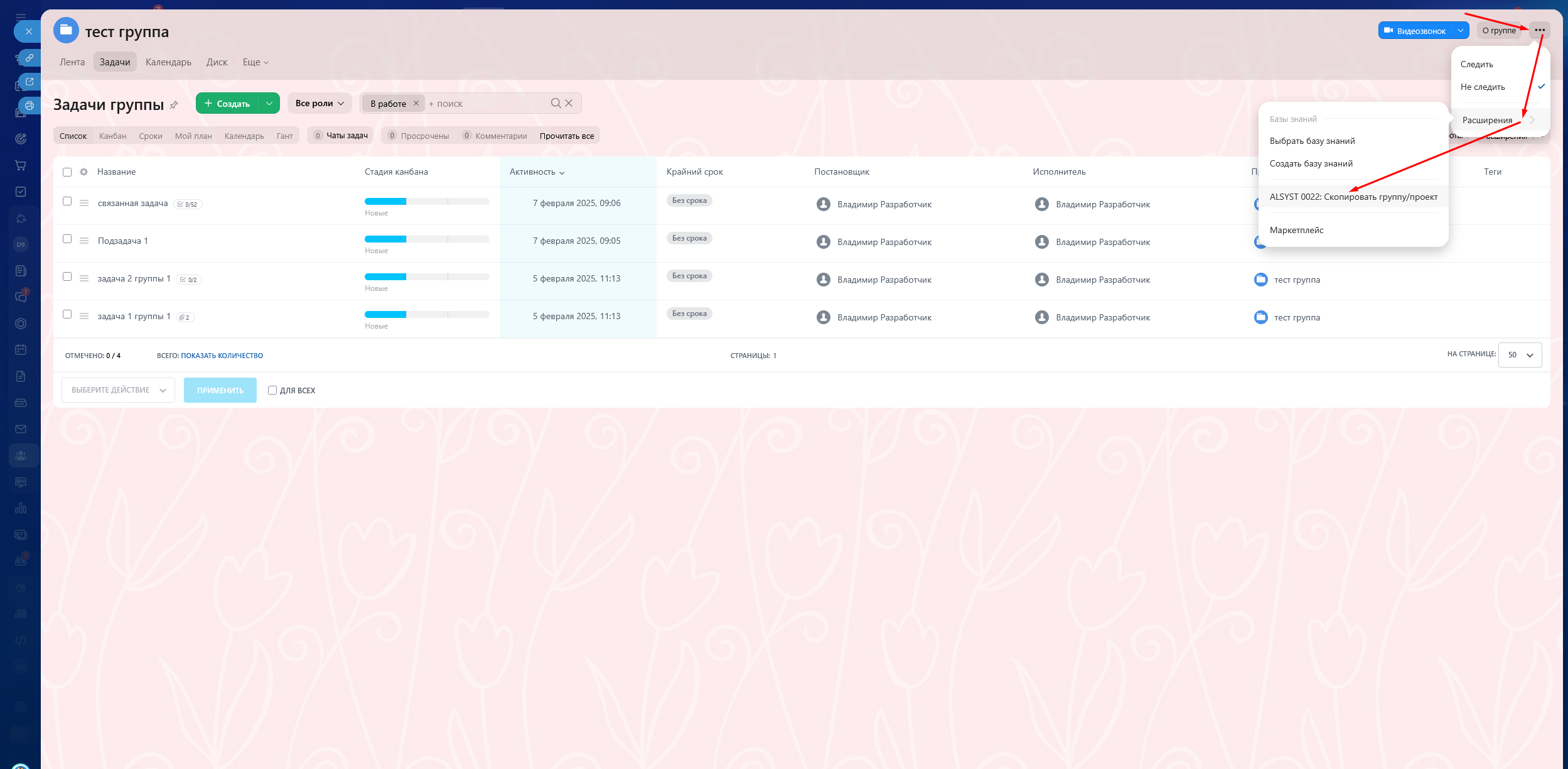 1. Запустить приложение из левого меню или в проекте/группе меню (...) -> Расширения.