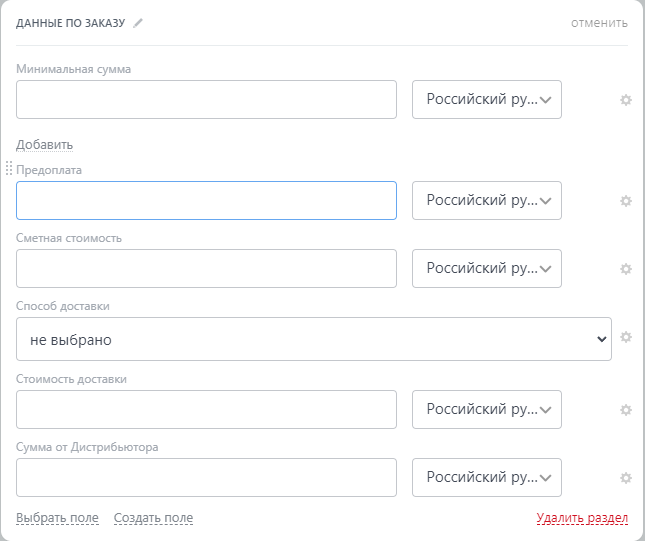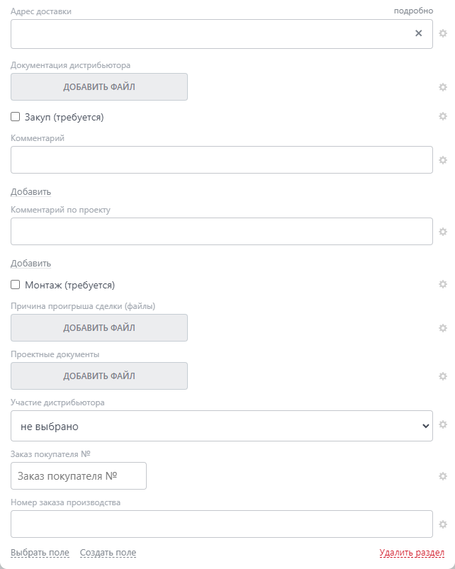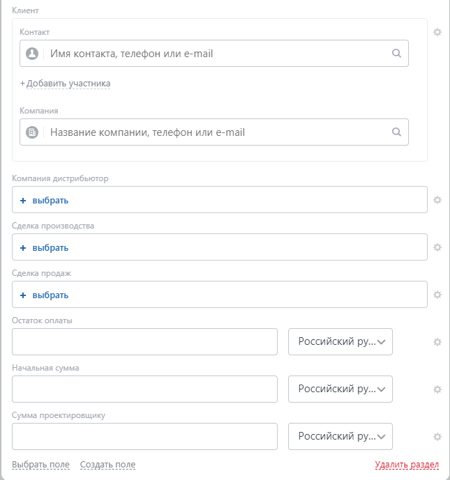 Настроены общие виды карточки сделок с разграничением полей по группам.