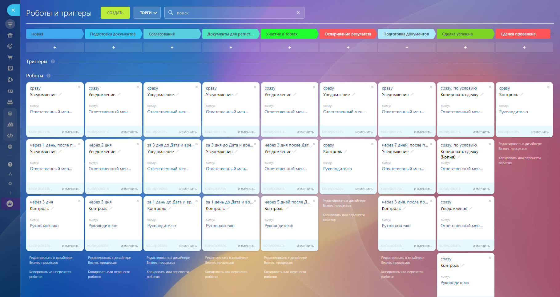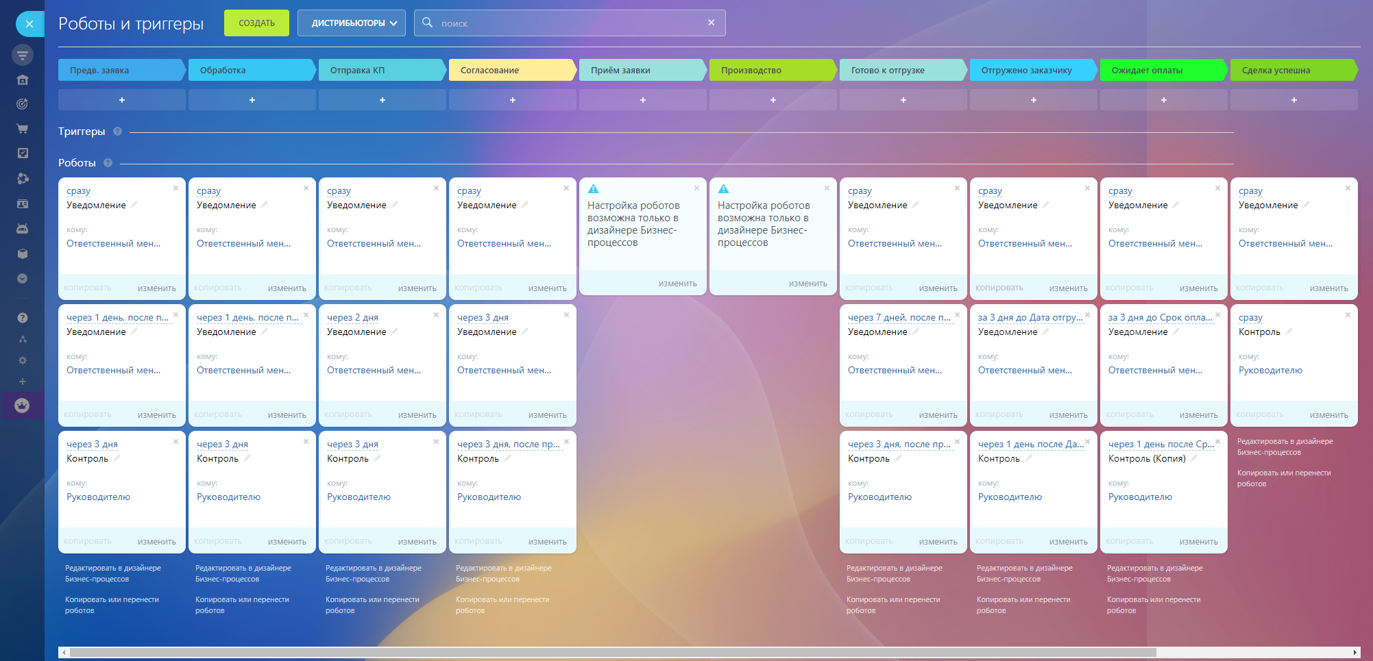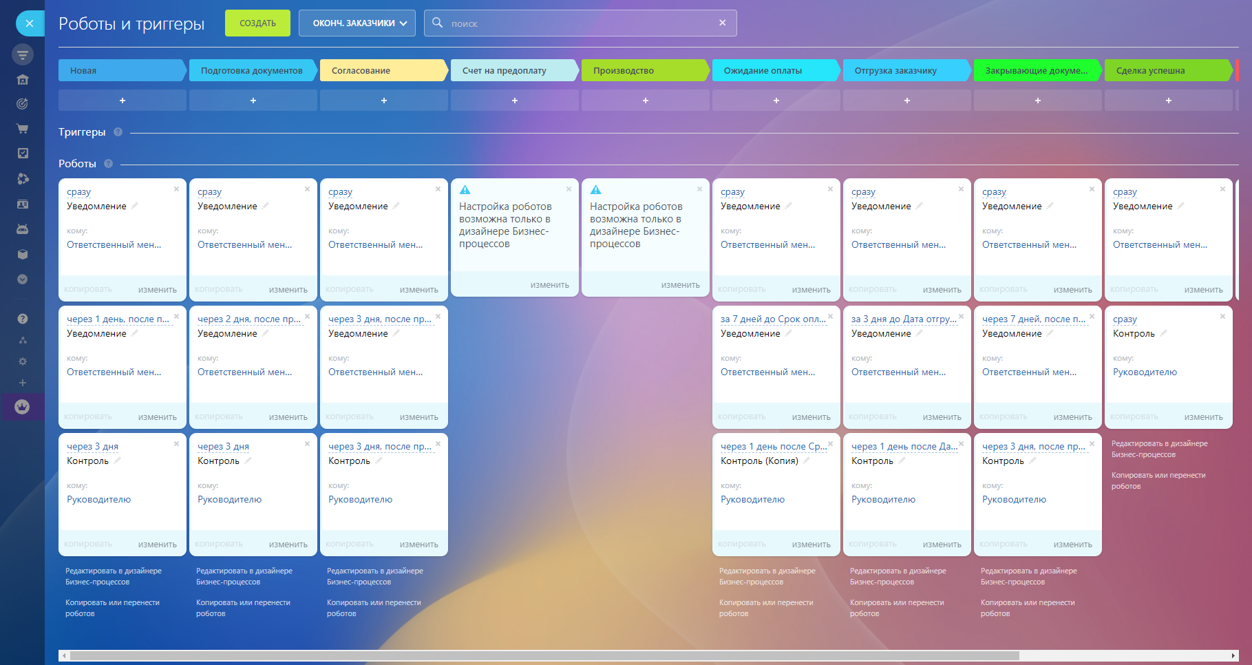 Добавлены уведомления и контроль на каждом этапе, чтобы менеджер смог активно работать с заказом. Контроль руководителю приходит в случае длительного простоя сделки.