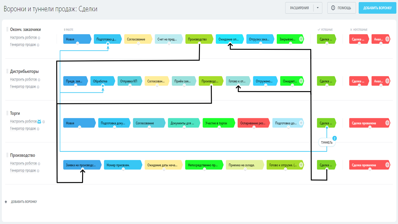 После прохода всех этапов производства сделка продаж менеджера автоматически переходит на следующий после производства этап.