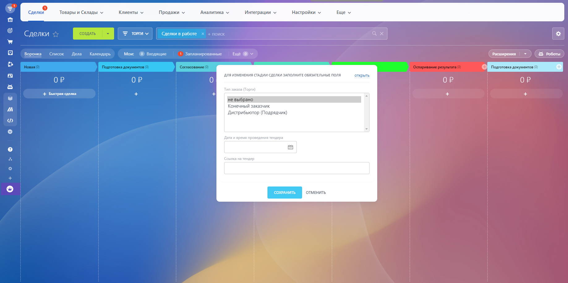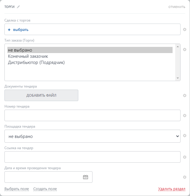 * Поле "Площадка тендера" - является списочным полем. В списке указаны 3 значения-примера. Для ведения актуальной информации в сделке необходимо изменить значения самостоятельно в разделе "Настройки" - "Настройки CRM" - "Настройки форм и отчетов" - "Пользовательские поля".
