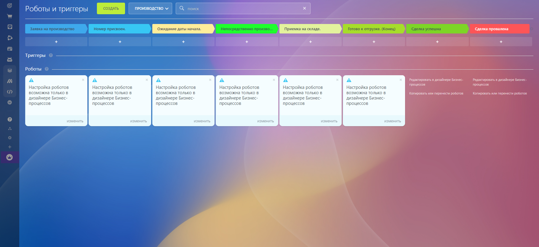 В процессе смены этапов производства менеджеру будут поступать уведомления о продвижении сделки по производству.