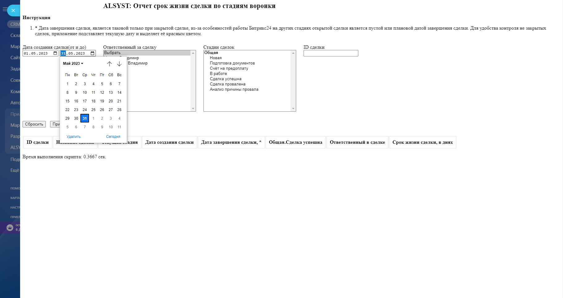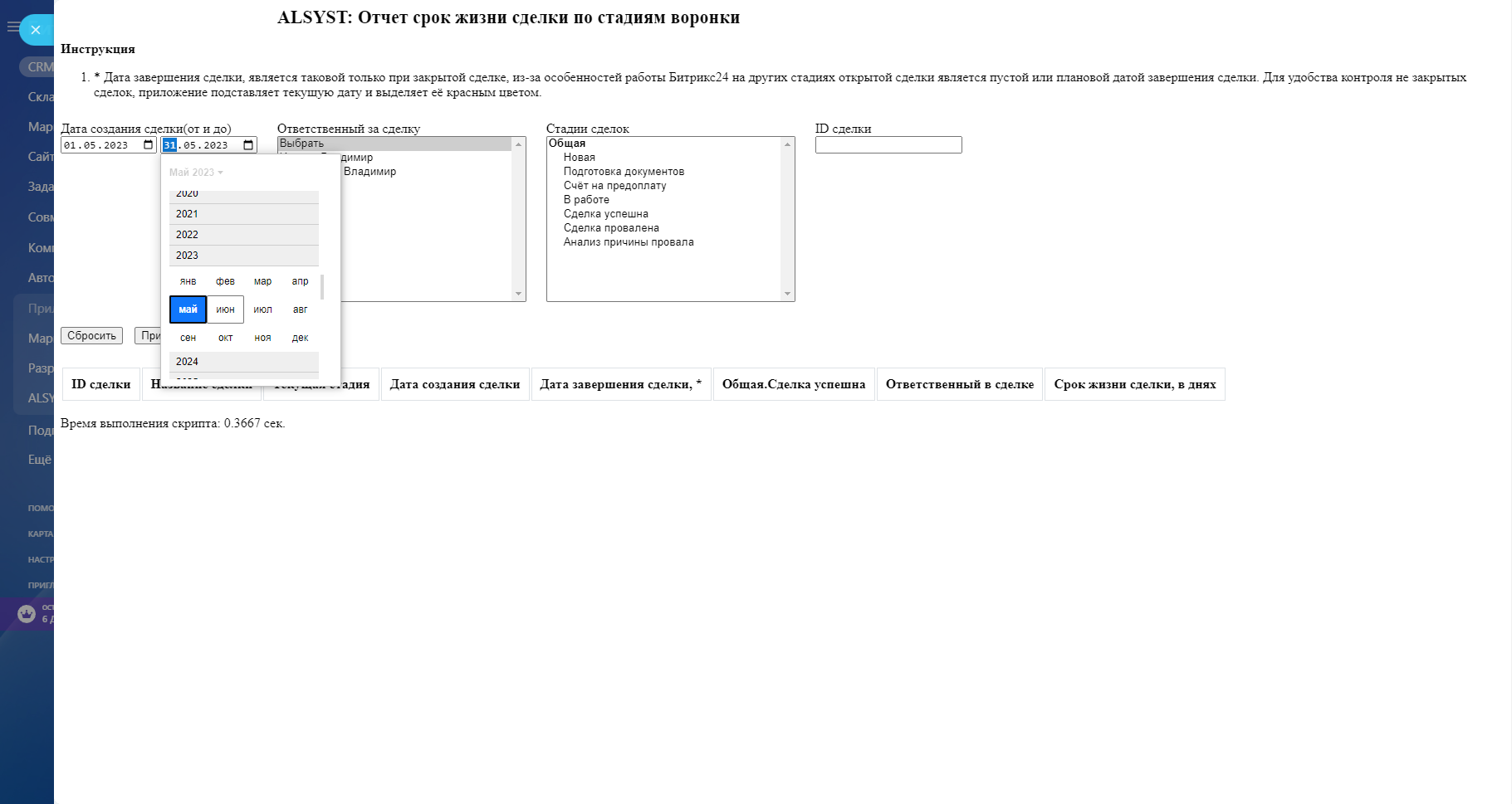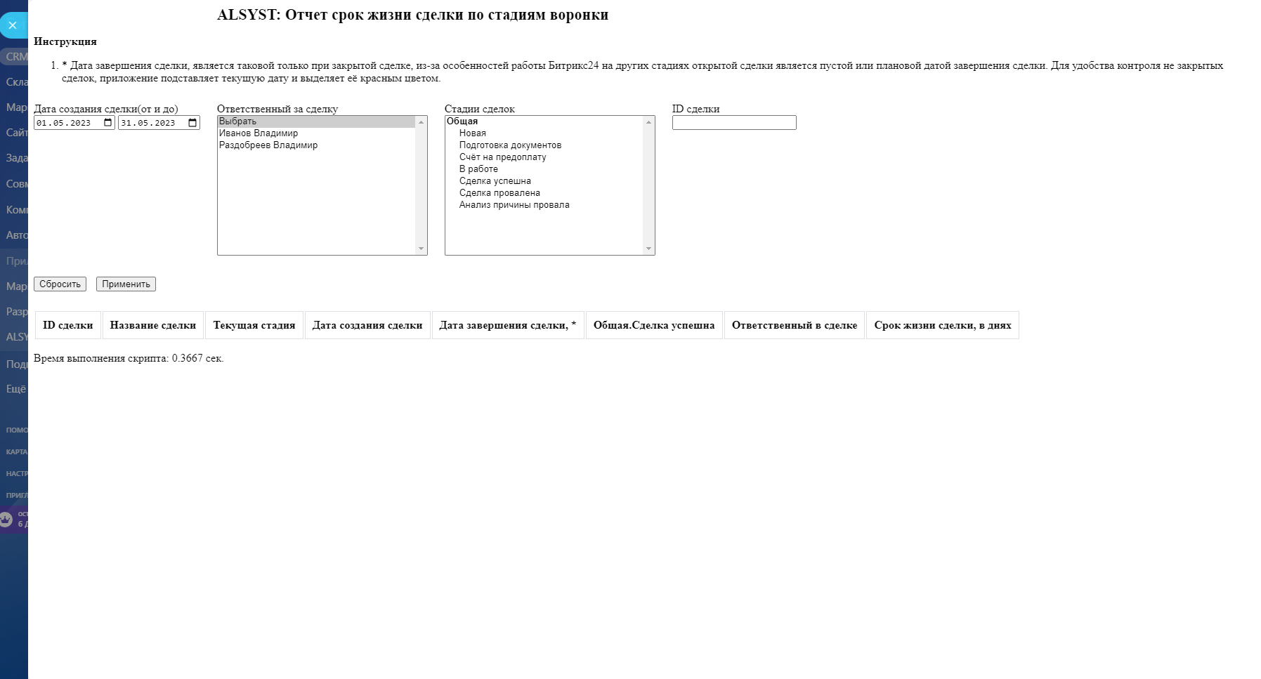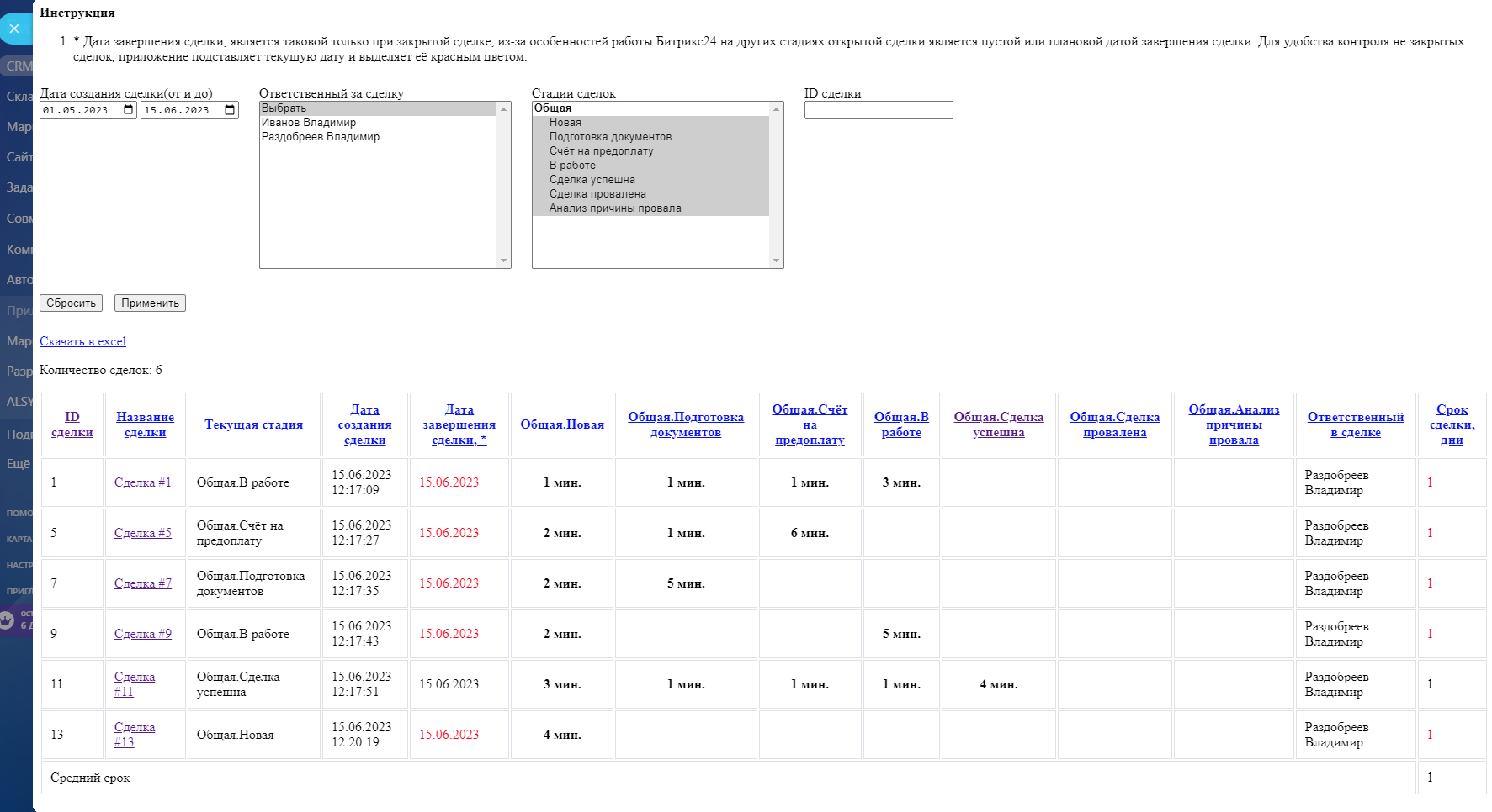Приложение формирует отчет по продолжительности нахождения Сделки для каждого пройденного этапа с момента создания и суммарного времени жизни сделки.