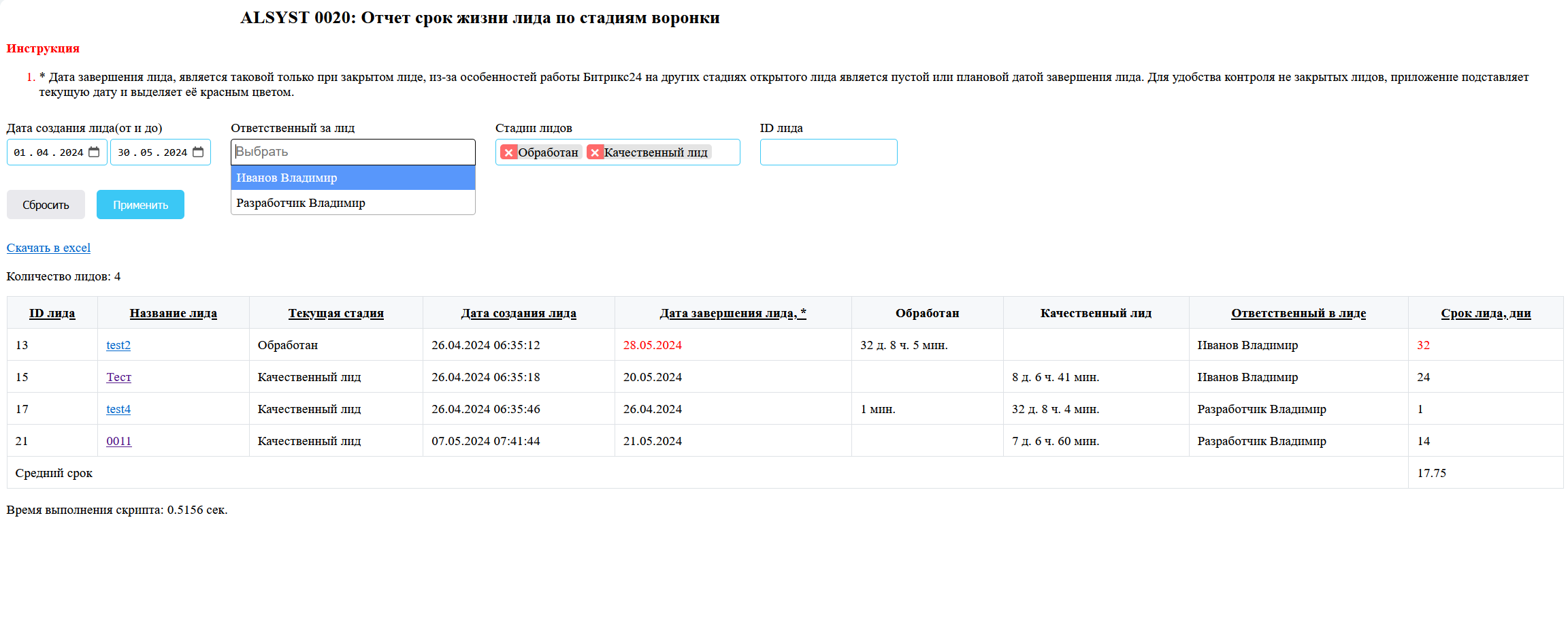Приложение формирует отчет по продолжительности нахождения Лида для каждого пройденного этапа с момента создания и суммарного времени жизни лида.