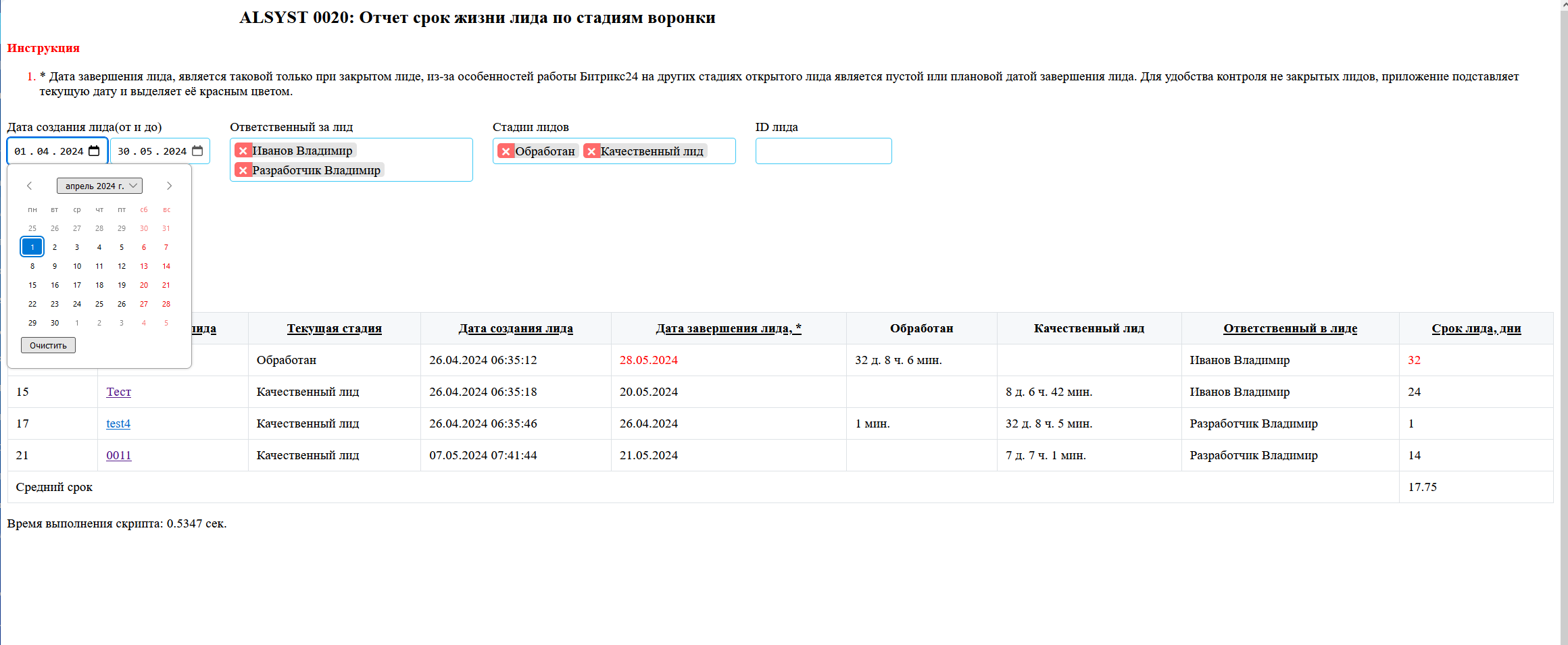 ALSYST 0020: Отчет срок жизни лида по стадиям воронки