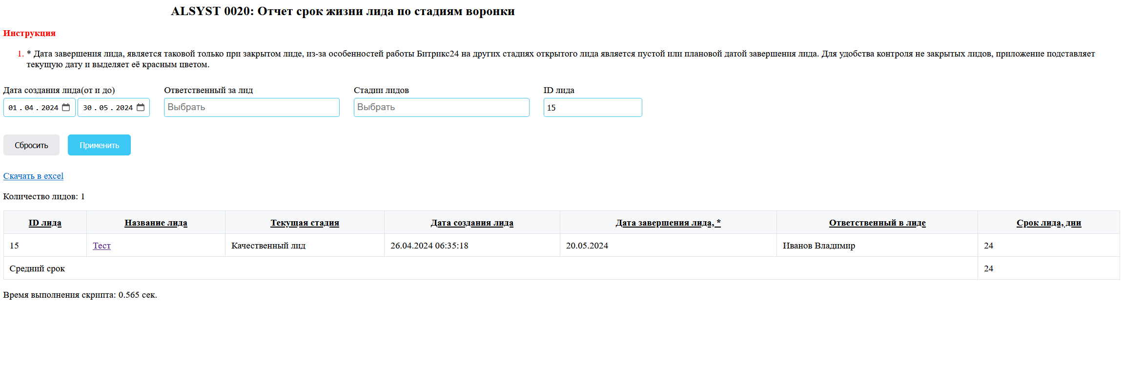 В результате вы получите список лидов по выбранным критериям. В отчёте будет предоставлен срок жизни в днях, часах и минутах лидов по стадиям, а в конце таблицы указано суммарное значение срока жизни.