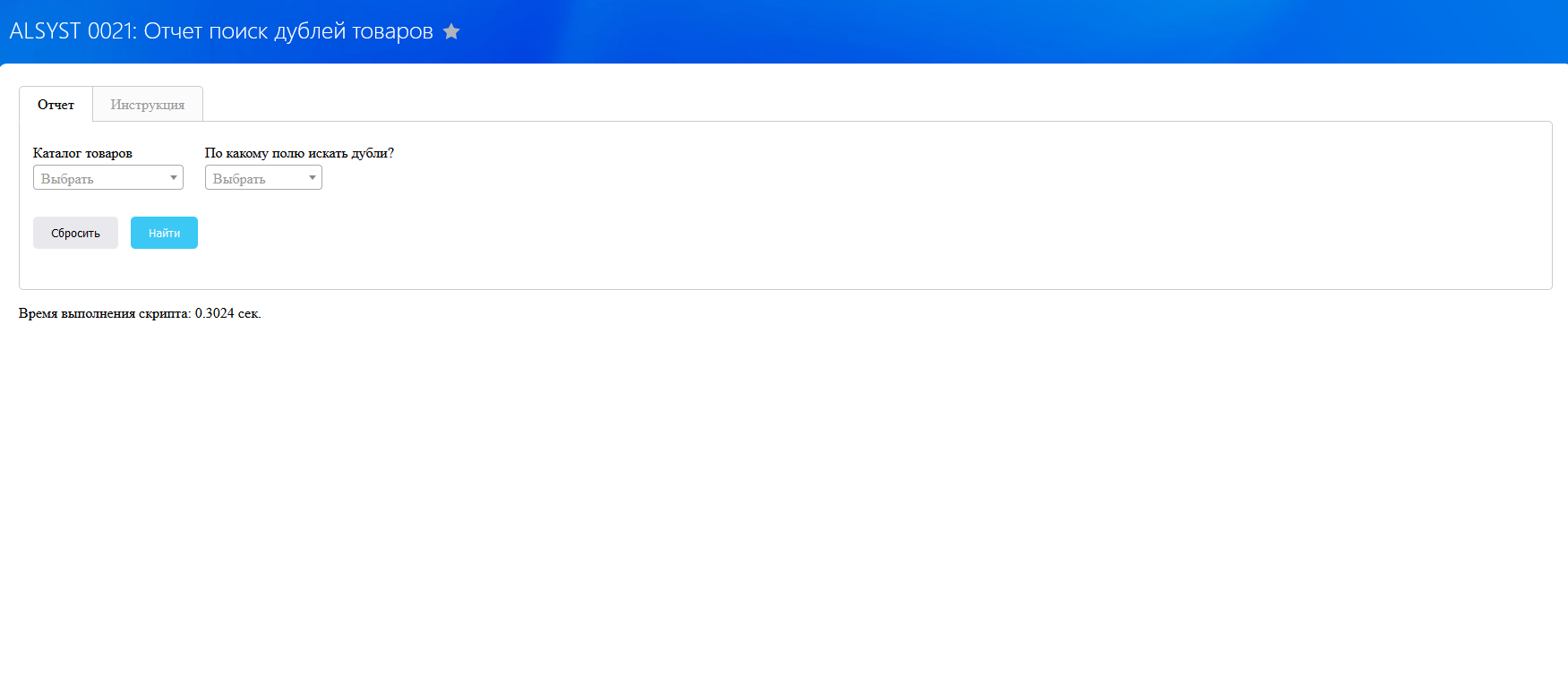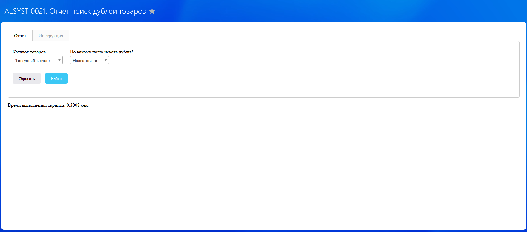 Приложение «ALSYST 0021: Отчет поиск дублей товаров» сформирует отчет по дублям товаров по Наименованию и внешнему коду.