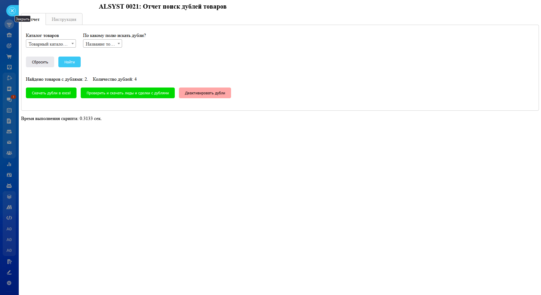 В результате вы получите список дублей товаров по выбранным критериям, а также список лидов и сделок с дублями простых товаров или услуг.
