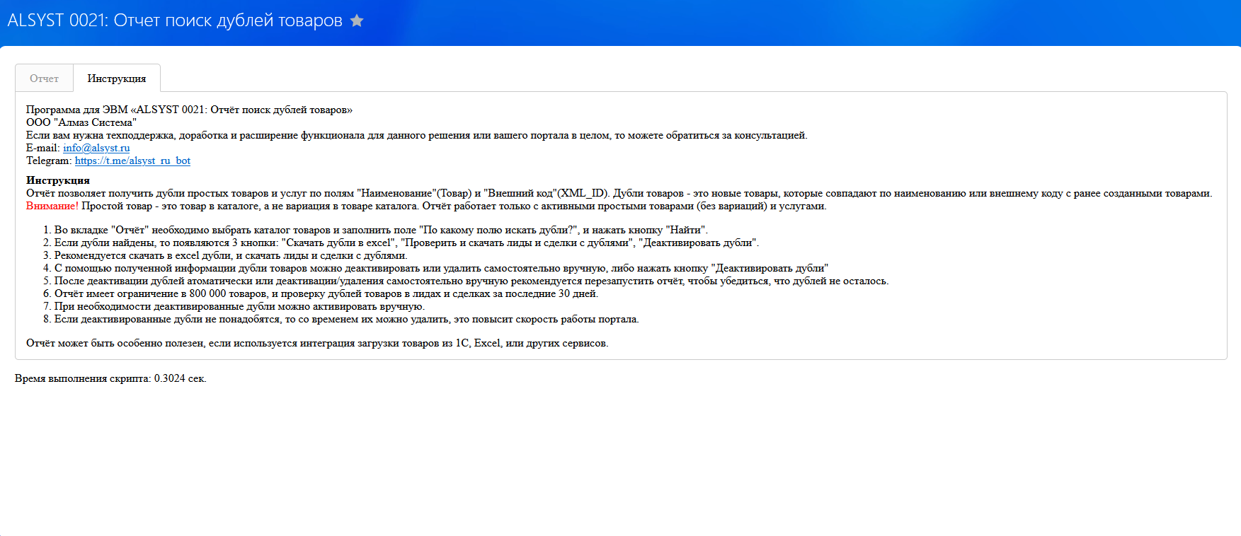 - Отчёт имеет ограничение в 800 000 товаров, и проверку дублей товаров в лидах и сделках за последние 30 дней.